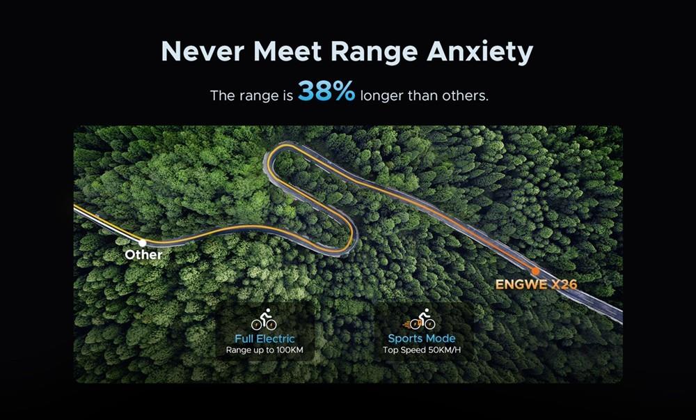 Двойная аккумуляторная система ENGWE X26 может помочь вам проехать 57,7 миль без подзарядки.. Этого достаточно, чтобы возить вас из города в город!
