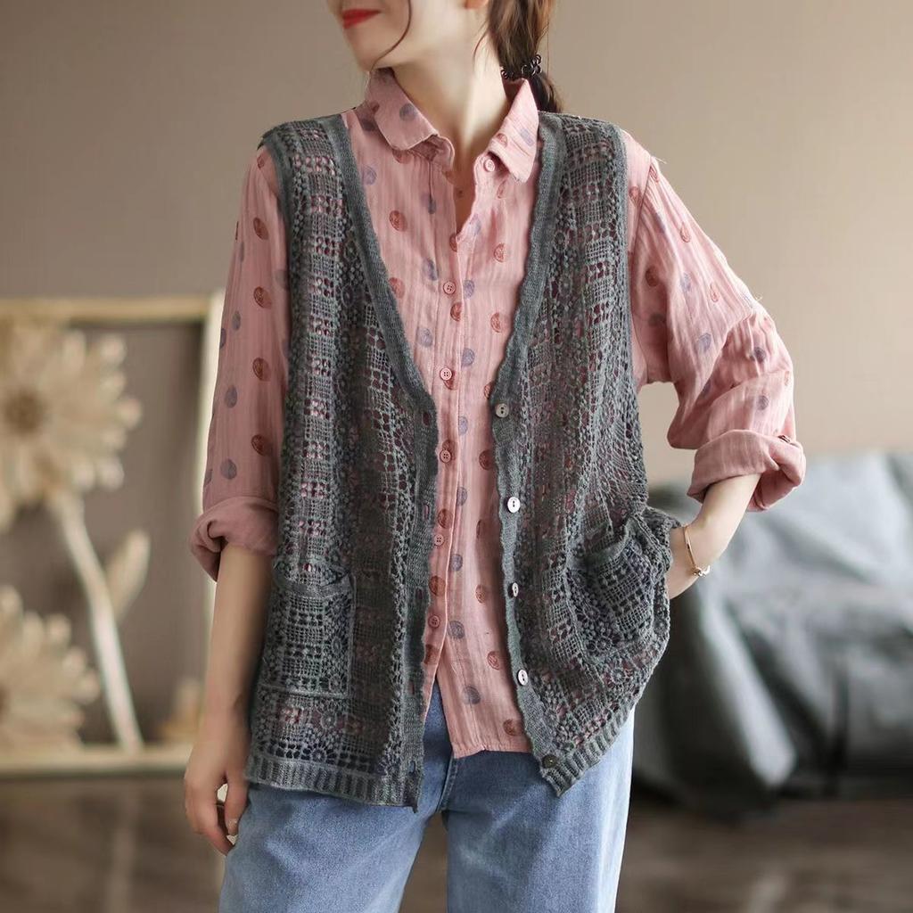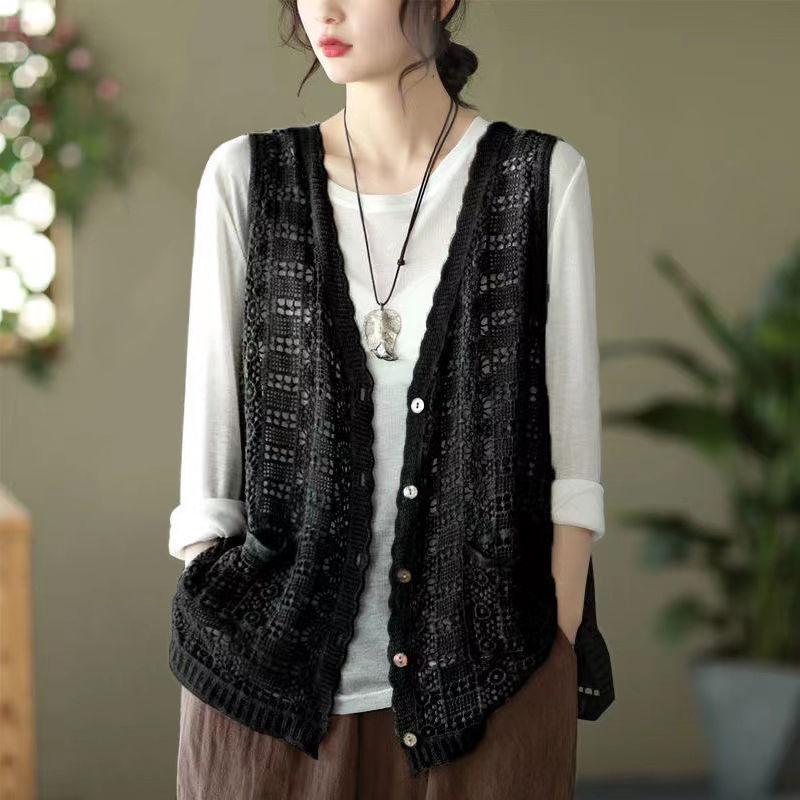 Этнический стиль Женский хлопковый жилет с ажурным узором Однобортный тонкий кружевной жилет Летний свободный кардиган Жилет Верхняя одежда