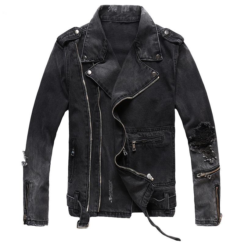 Высококачественная мужская куртка-байкер на молнии из черного денима для мотоцикла, винтажные дырки для погон, рваные потертые пальто — купить товар онлайн с бесплатной доставкой по всему миру!