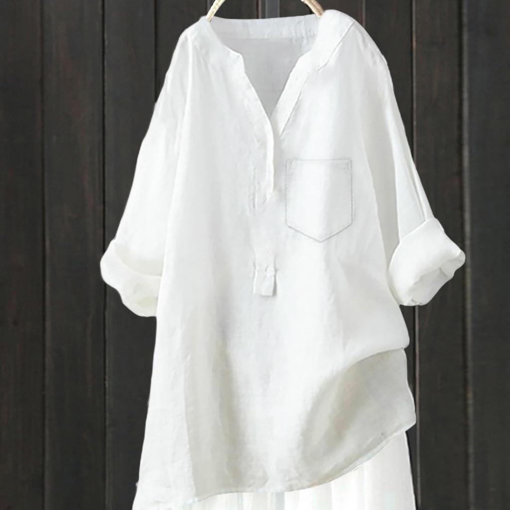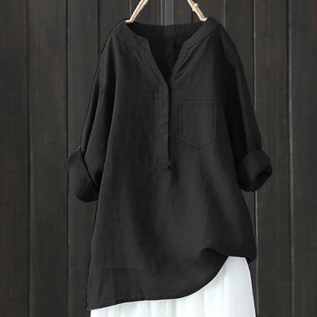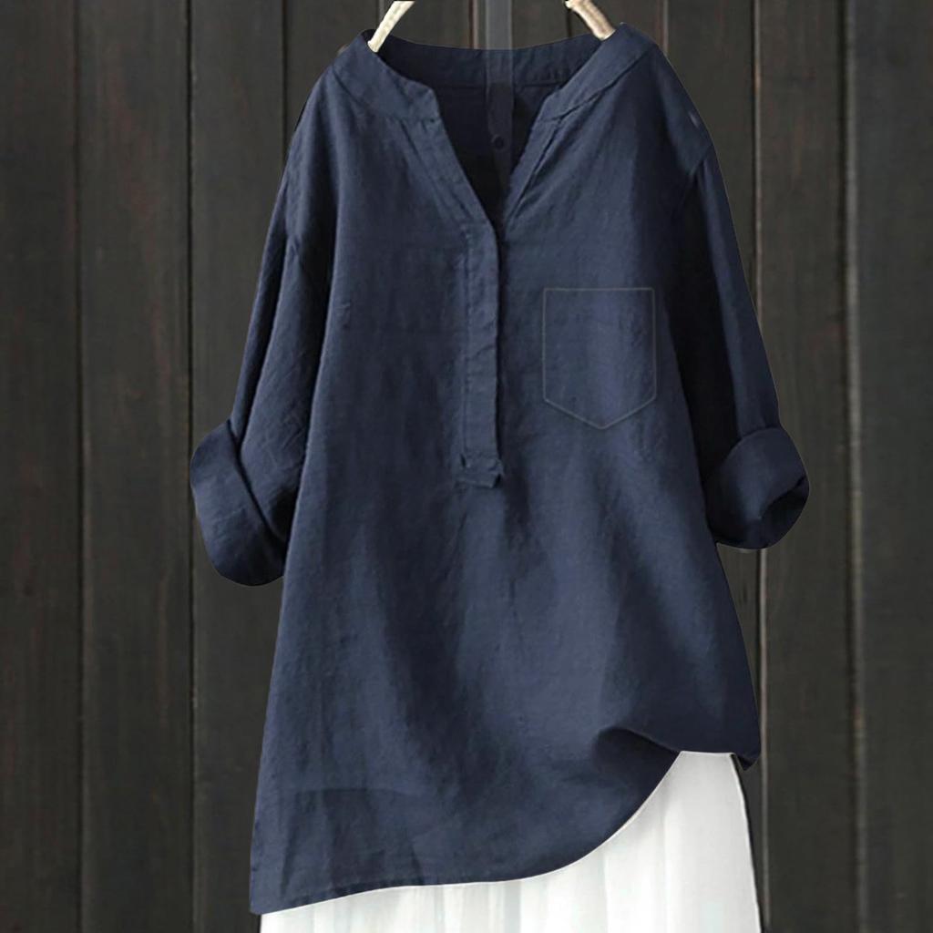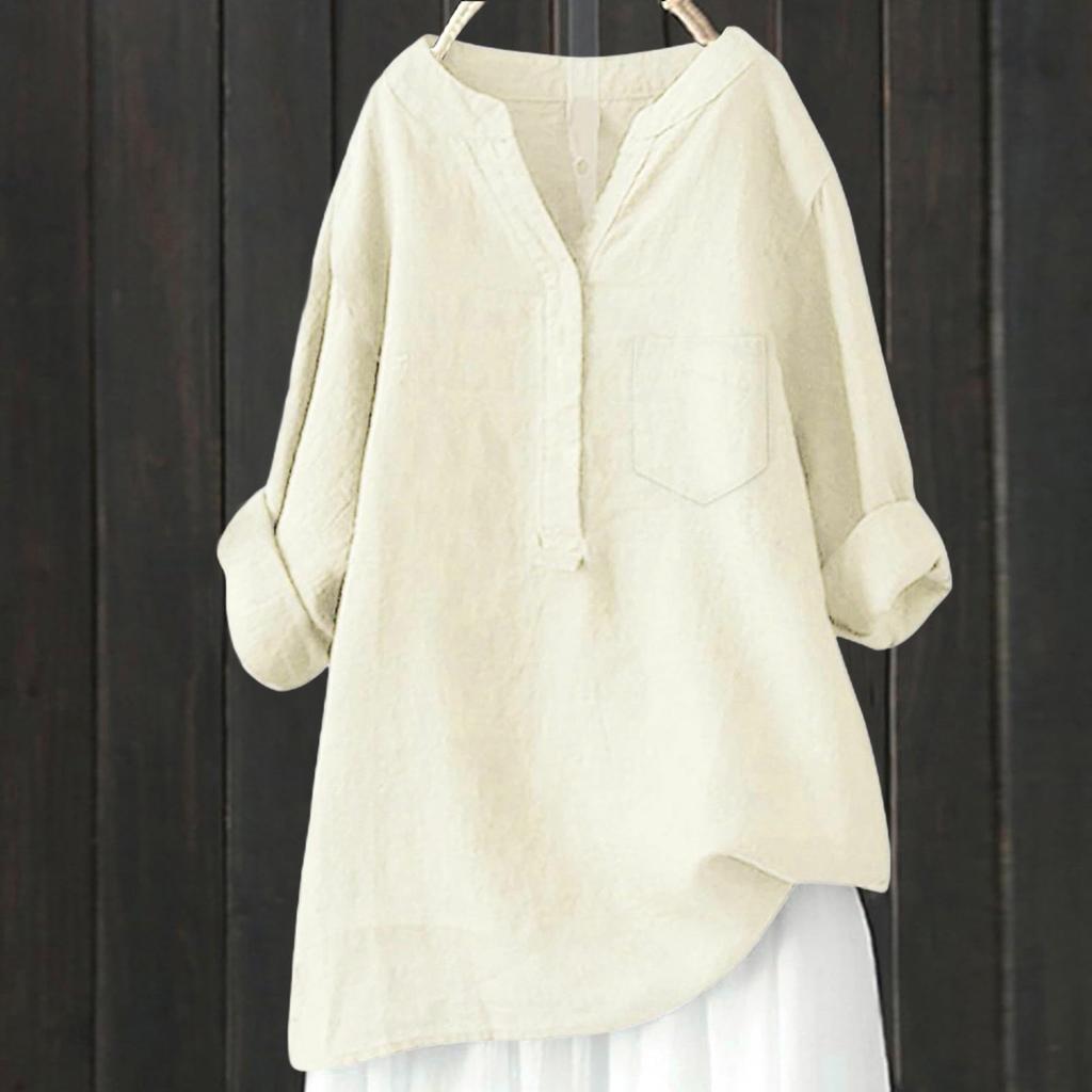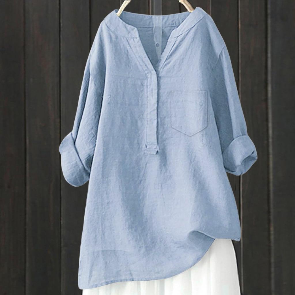 Женский свободный однотонный топ из хлопка и льна с воротником-стойкой и длинными рукавами на пуговицах