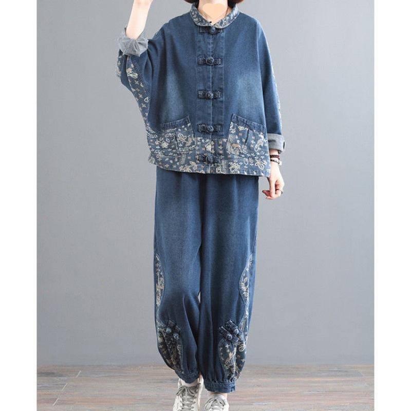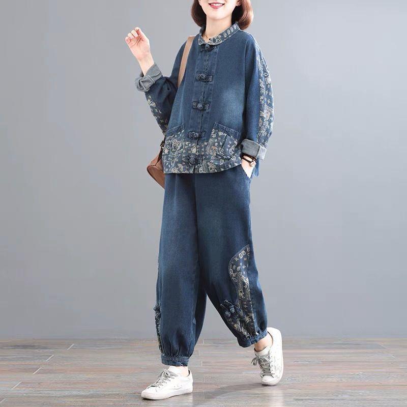 Женский комплект из двух джинсов, весна-осень, винтажный джинсовый костюм с пряжкой и принтом, женские брюки больших размеров, комплект из двух предметов