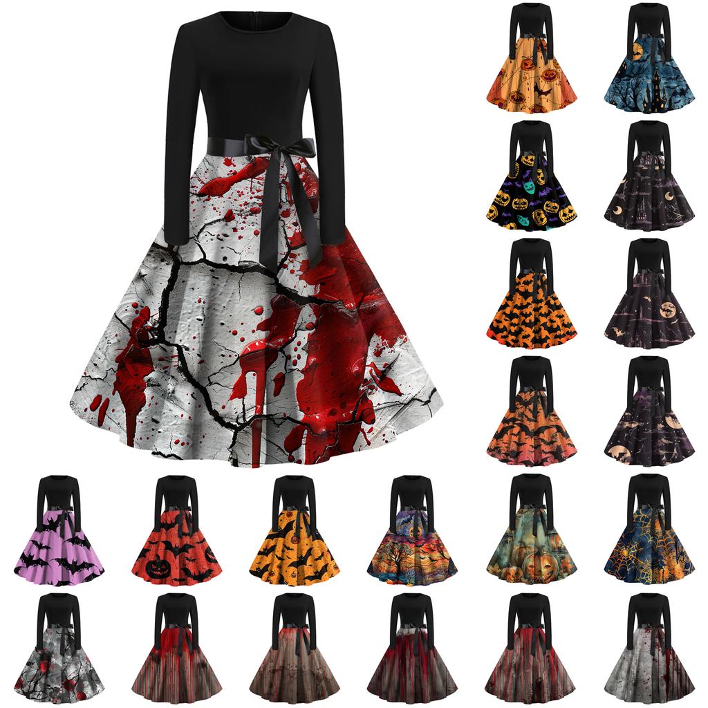 Платье-клеш с принтом на Хэллоуин для женщин с длинным рукавом, повседневные платья с круглым вырезом и ажурной отделкой — купить товар онлайн с бесплатной доставкой до всему миру!