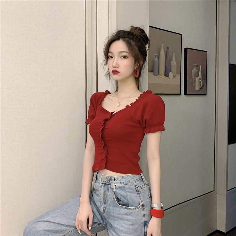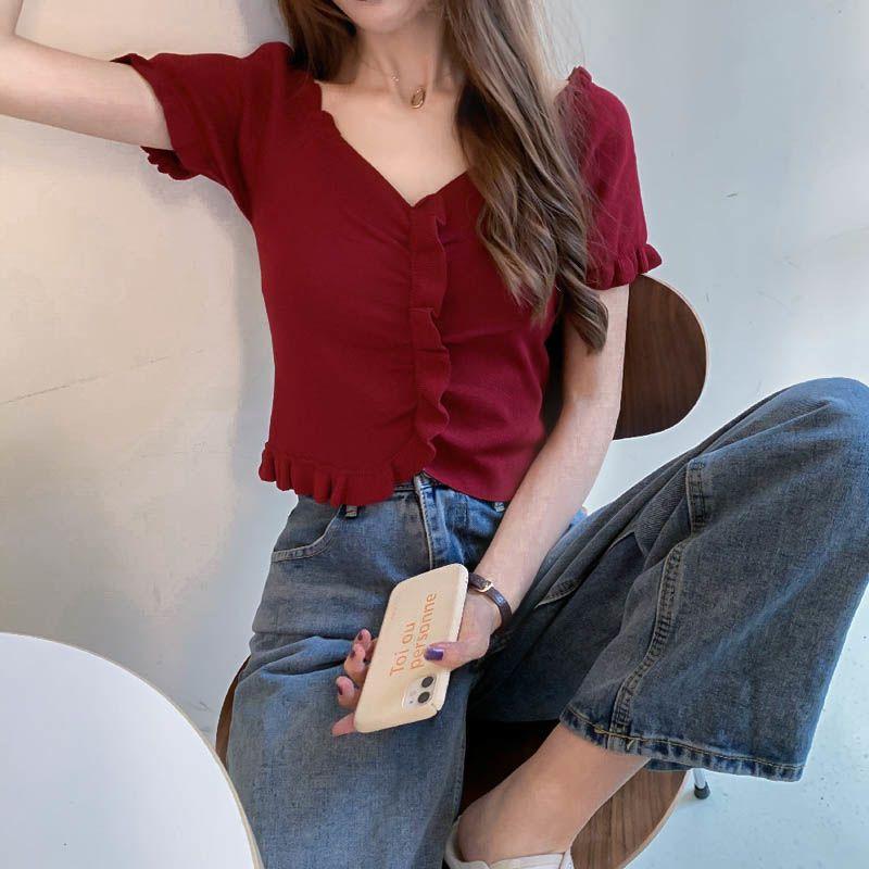 Летний топ, женская корейская версия, шикарная футболка с французским V-образным вырезом, открытой ключицей, короткими рукавами и вязаным свитером с рисунком грибка