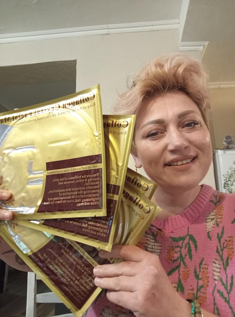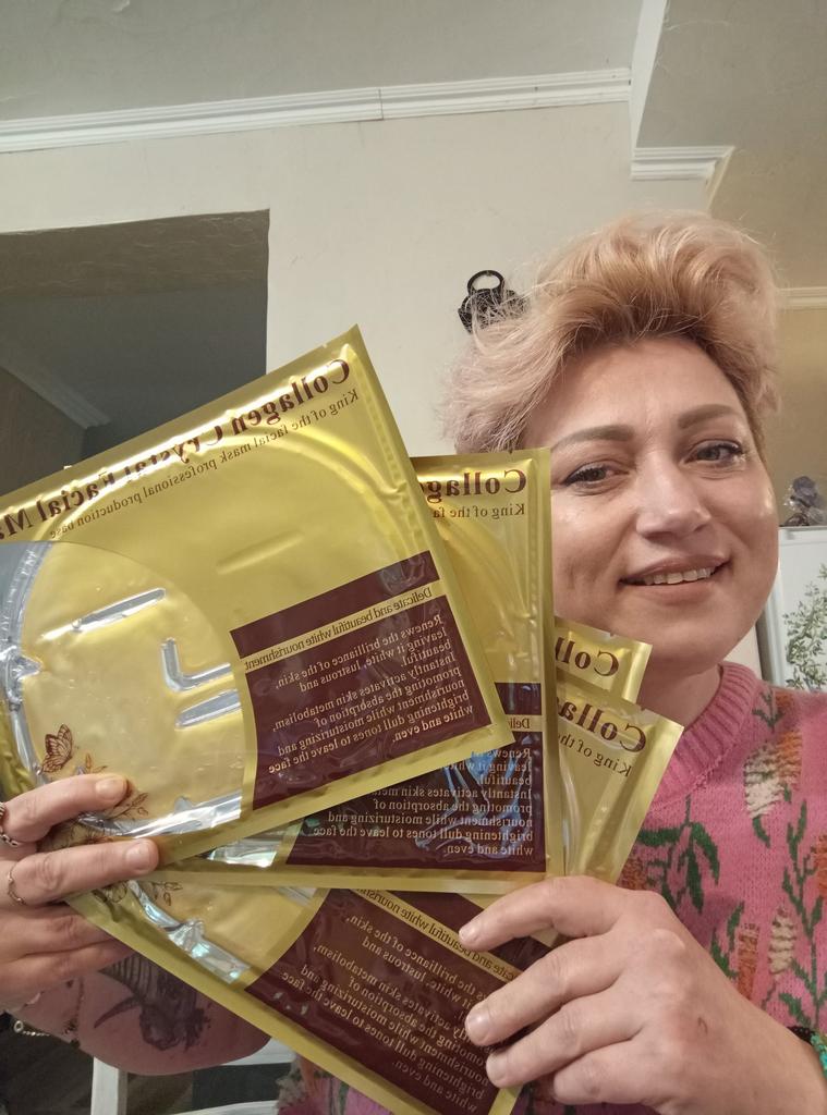 Маска для лица с коллагеном Выглядит как патчи, только на все лицо Подойдёт как экстренное средство для быстрого восстановления кожи после солнечного ожога, при отеках, после бессонной ночи и т. д. Классно разглаживают и освежает В наборе 3 маски Каждая маска на подложке, жидкости очень много, льётся со всех сторон