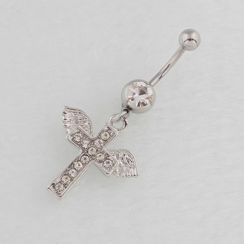 Пирсинг пупка в виде крестообразного кольца из гипоаллергенной нержавеющей стали.