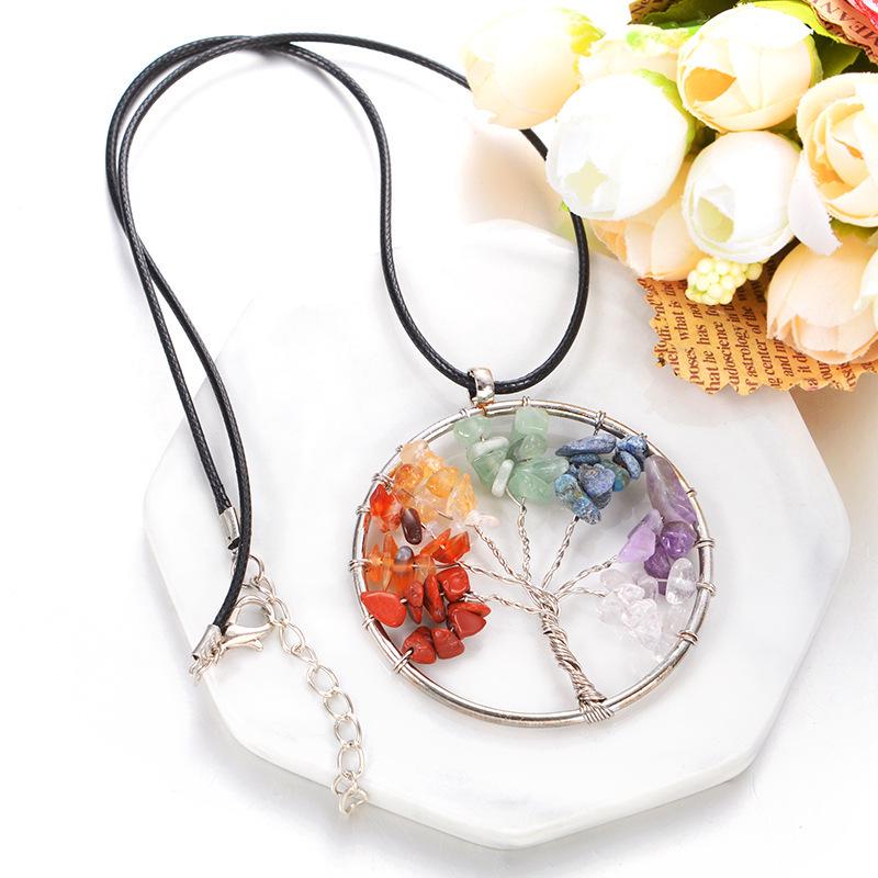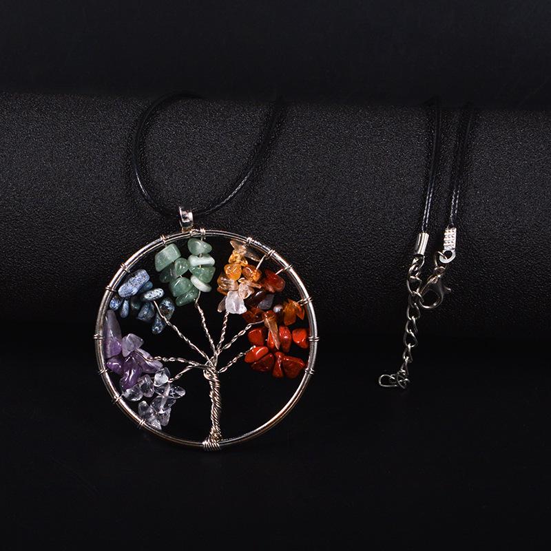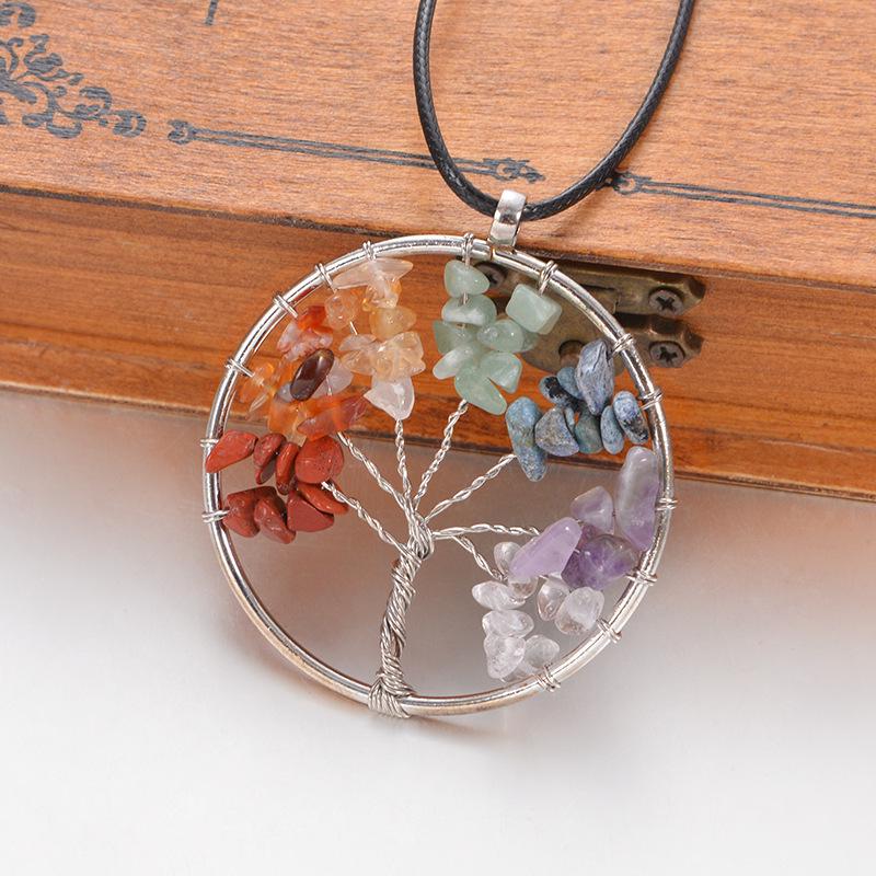 Ожерелье с подвеской «Дерево жизни» из цветного натурального камня и кожаной веревкой