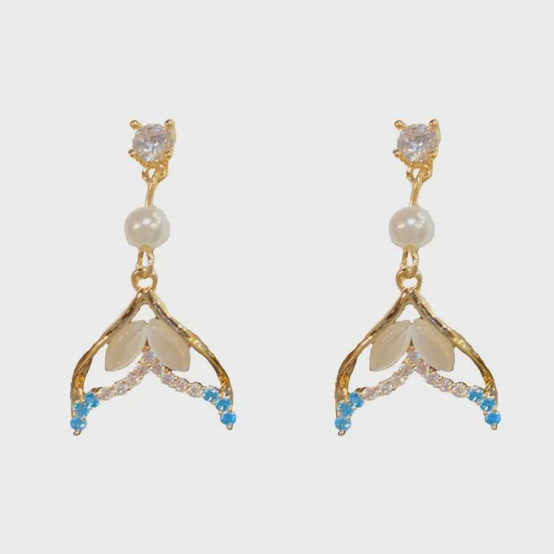 МодельЗолотые серьги с жемчугом «рыбий хвост» из циркона (толстое покрытие из настоящего золота)