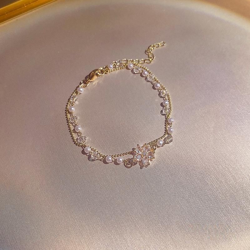 Модный браслет из титановой стали с двойной жемчужиной и цветком из циркония для женщин - корейские модные украшения