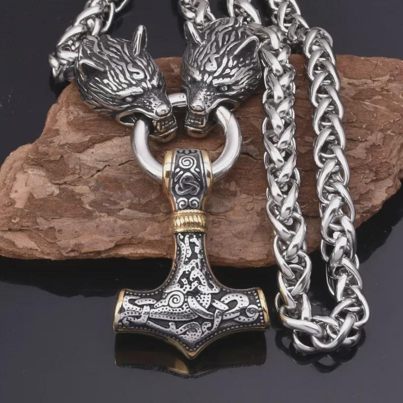 Мужское панк-колье в стиле ретро с нордическим руническим молотом и головой волка
