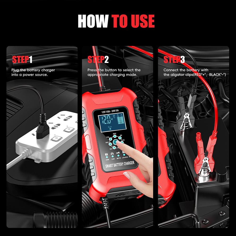 • 7-ступенчатые зарядные устройства подходят для большинства типов батарей, включая кальциевые, гелевые AGM, LiFePo4, мокрые, свинцово-кислотные батареи. Они также могут помочь восстановить разряженные и сульфатированные батареи..