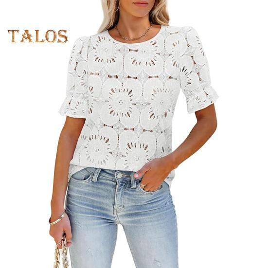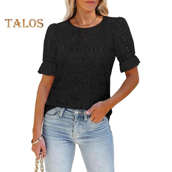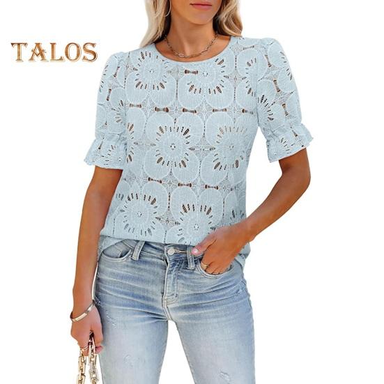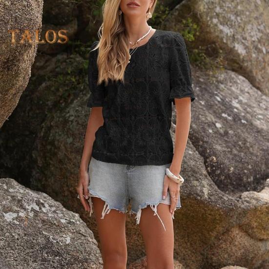 Изысканный кружевной принт и пушистые короткие рукава придают изделию нотку элегантности.. Эта повседневная рубашка с круглым вырезом и свободным кроем универсальна и легко сочетается с другими вещами..
