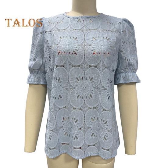 Элегантный кружевной принт и пышные рукава: Украшенный изысканным кружевным принтом и очаровательными пушистыми короткими рукавами, этот топ излучает изысканность.. Круглый вырез и свободный крой добавляют нотку официальности к повседневному очарованию, делая его универсальным дополнением к вашему гардеробу.