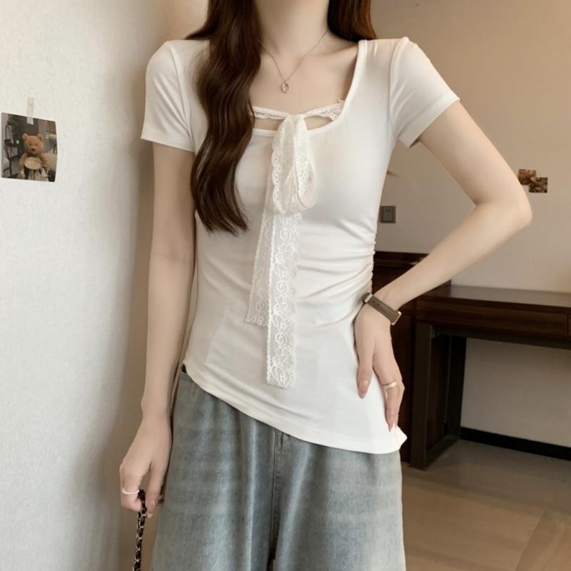 Summer Short Sleeve Women's Solid O-Neck irregular Pullovers korean Lace ribbon t-Shirts y2k Tops Female Slim pure cotton Tees — купить товар онлайн с бесплатной доставкой по всему миру!
