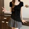 Летние женские однотонные пуловеры с коротким рукавом и круглым вырезом, корейские футболки с кружевом и лентами, топы y2k, женские приталенные футболки из чистого хлопка