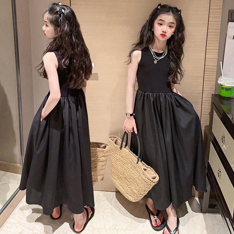 Платья для девочек Модное летнее платье для девочек Высокого класса, черное однотонное длинное платье для детей, летнее платье без рукавов