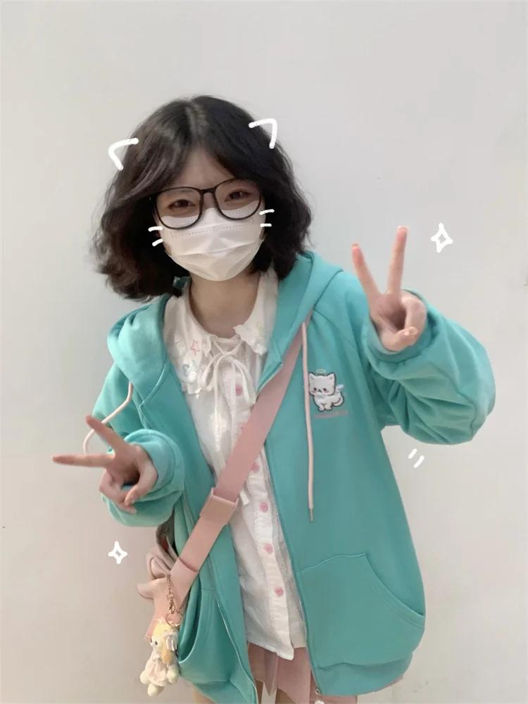 2025 Harajuku Cat Ear Kawaii толстовки с капюшоном на молнии для женщин в японском стиле, симпатичная куртка с капюшоном, большие свитшоты Sweet Lolita Girly