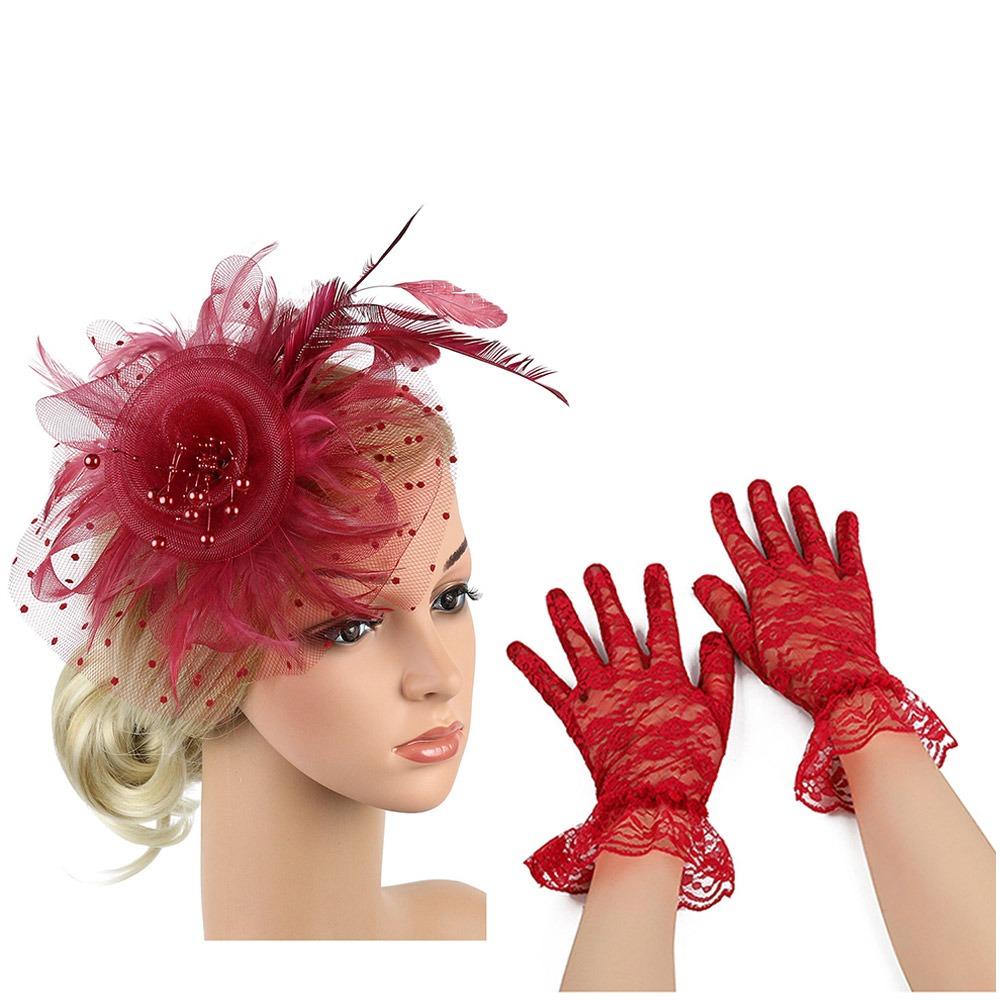 Wedding Fascinator Hat Cocktail Tea Party Headband Feather Headpiece & Gloves Set for Women Girls