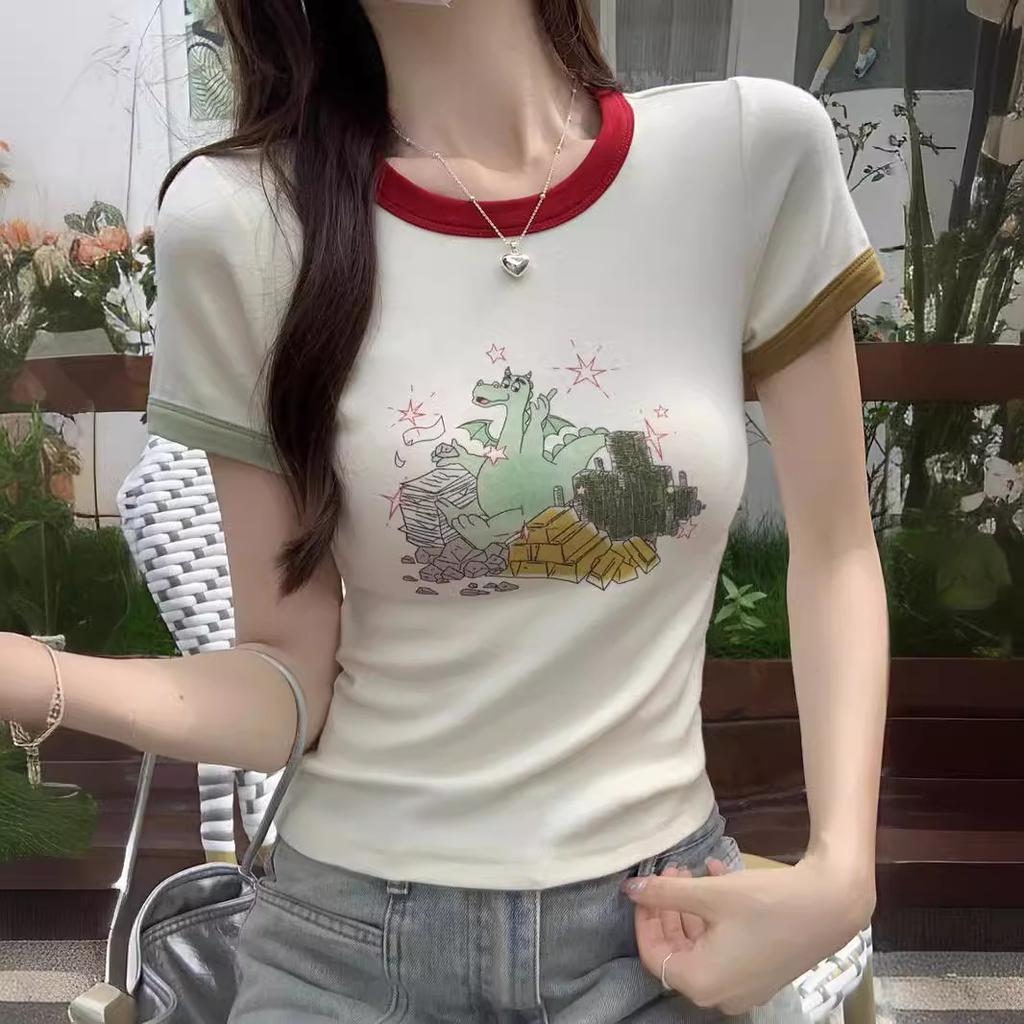Женская футболка с коротким рукавом и принтом на переднем плече, летняя новинка, контрастного цвета, с круглым вырезом, сладкая приталенная короткая майка