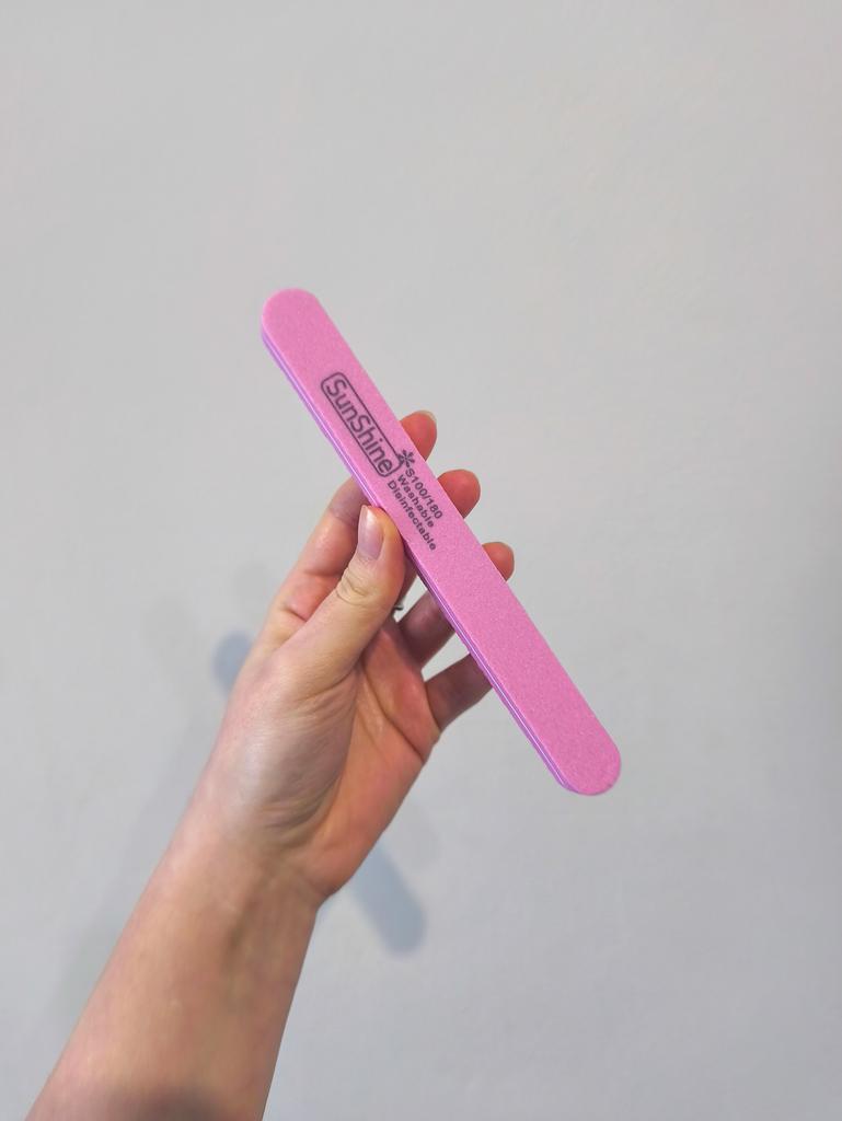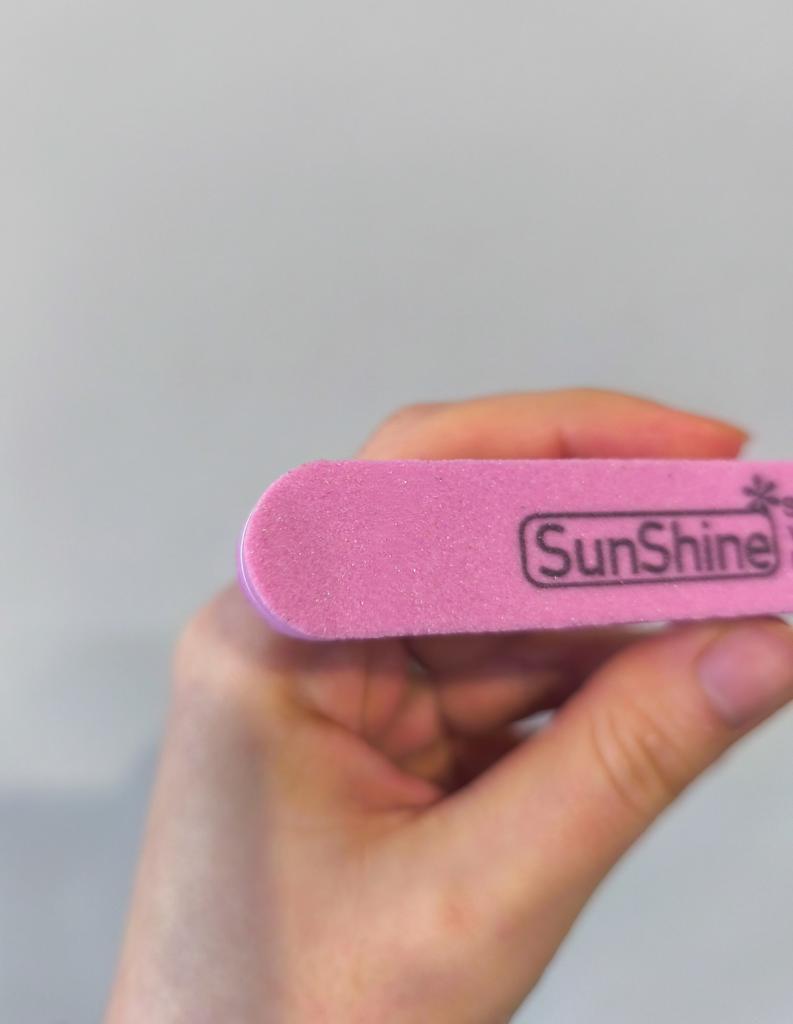 💅 Пилка SunShine S100/180 Эта розовая пилка — базовая вещь, которая должна быть в каждой косметичке. Вот почему она хороша: 🔸Двусторонняя абразивность: * Сторона 100 грит — довольно жесткая, отлично подходит для опила длины и формы искусственных ногтей (гель, акрил). 🔸Сторона 180 грит — более мягкая, идеальна для коррекции натуральных ногтей. 🔸Практичность: На ней указано, что она Washable (моющаяся) и Disinfectable (подлежит дезинфекции). Это огромный плюс для гигиены — ее можно мыть водой с мылом после использования. 🔸Форма: Классическая прямая форма удобна для создания четкого «квадрата» или «овала».