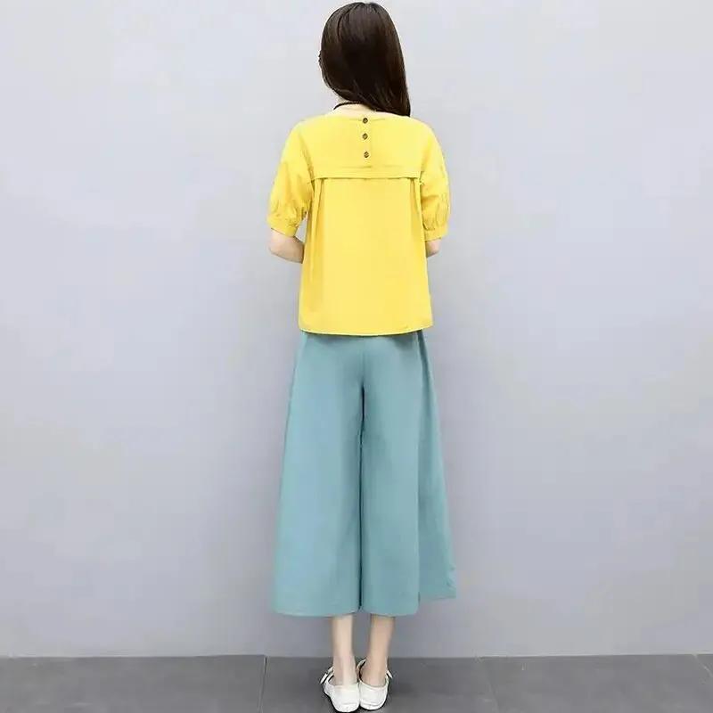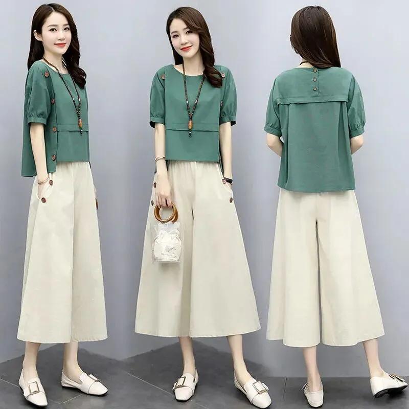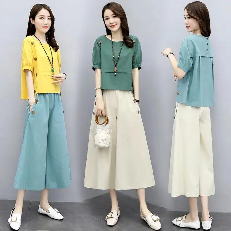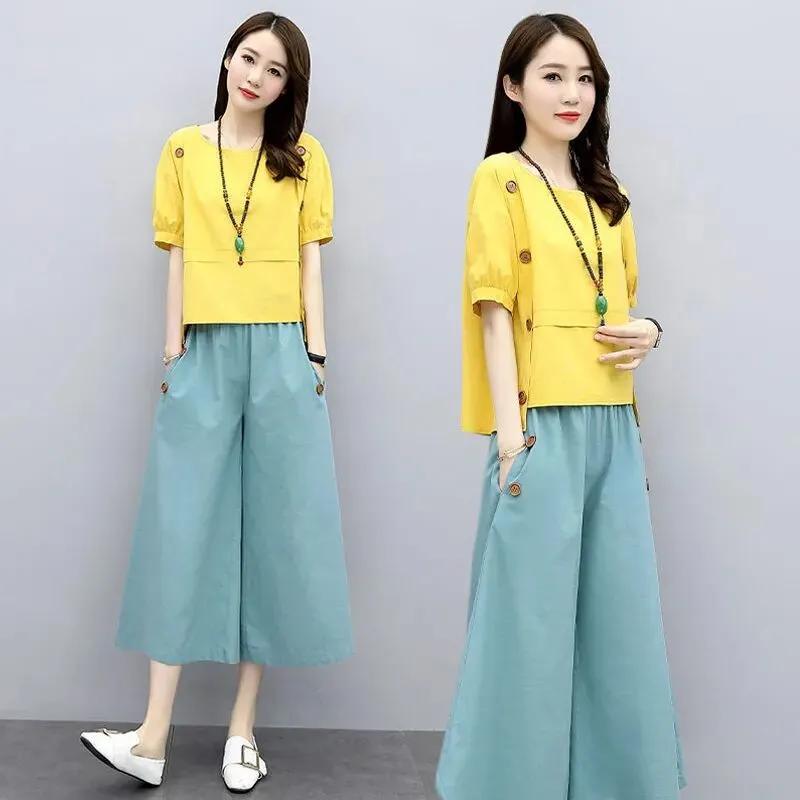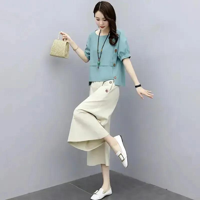 Женская летняя одежда, комплект в этническом стиле, утягивающий топ с короткими рукавами и широкие брюки, повседневный комплект из двух предметов