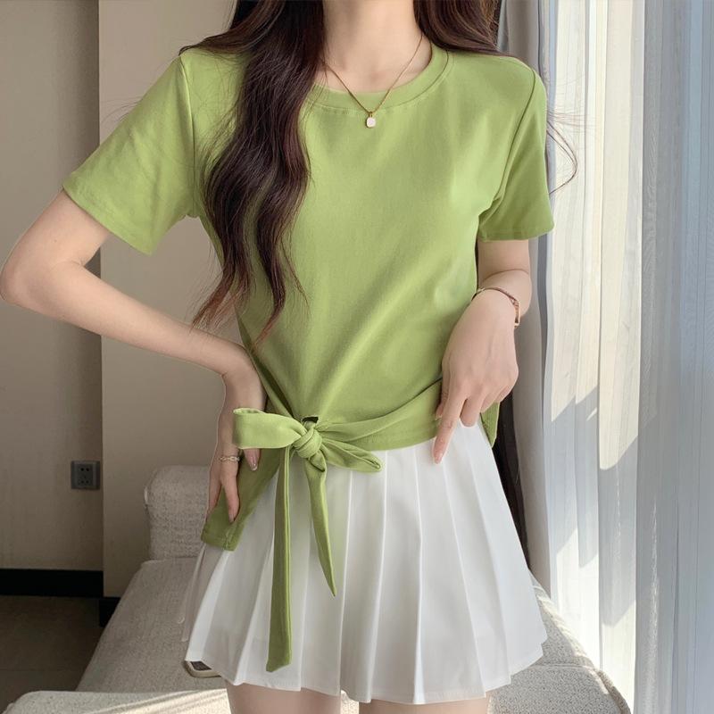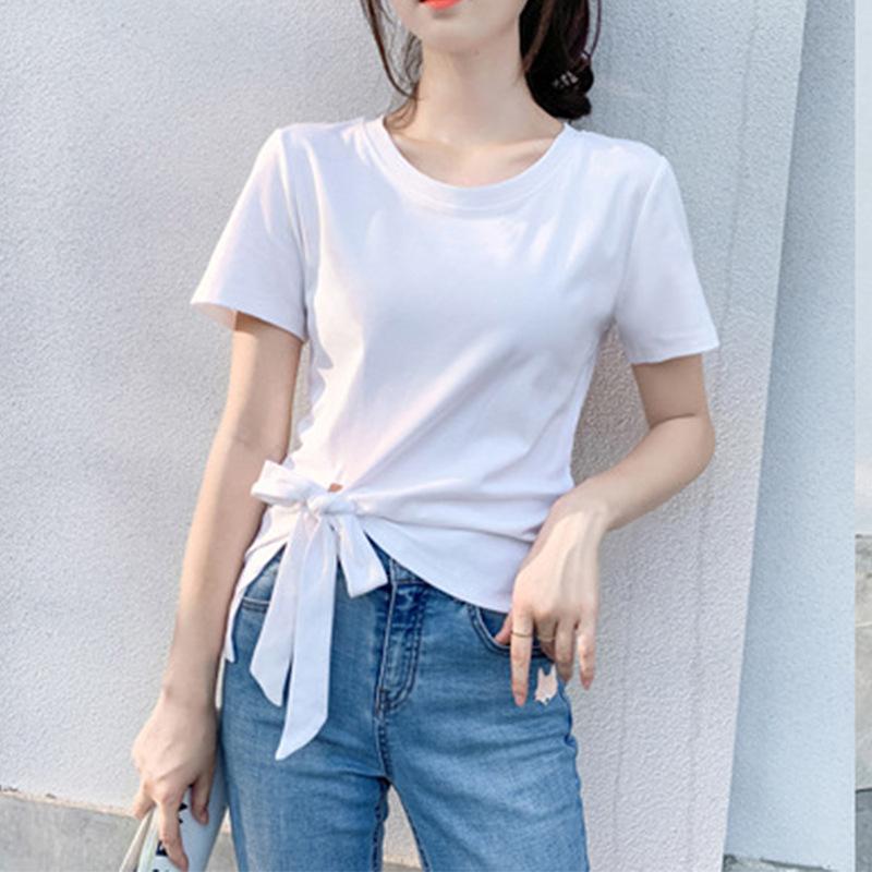 Новая летняя футболка с короткими рукавами для женщин с круглым вырезом, однотонная, нестандартная, со шнуровкой, облегающая, универсальная и шикарная женская футболка