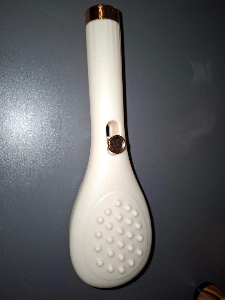 Расчёска с пластмассовым корпусом и силиконовыми щетинками, на мой взгляд они немного коротковаты. На обратной стороне поверхность с небольшими выступами- "пупырышками", предназначена видимо для массажа головы. Самовыдвижение регулируется рычажками, которые, к сожалению, при расчесывании постоянно соскакивают вниз, соответственно пряча щетинки расчёски. Приходится при расчесывании пальцем придерживать рычажок в верхнем положении.