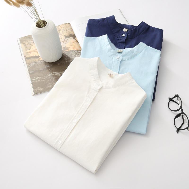 Рубашка из хлопка и льна, белая рубашка с воротником-стойкой, женская рубашка с длинными рукавами
