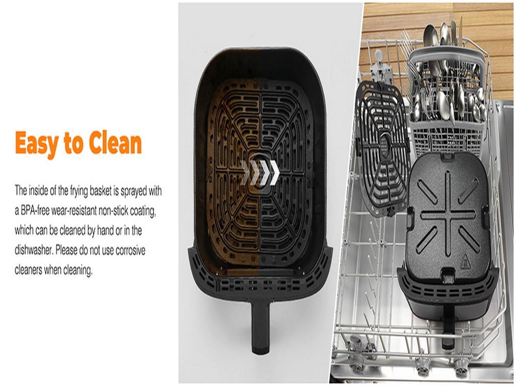 Внутренняя часть корзины для жарки покрыта износостойким антипригарным покрытием, не содержащим BPA, которое можно мыть вручную или в посудомоечной машине.. Пожалуйста, не используйте едкие чистящие средства при чистке.
