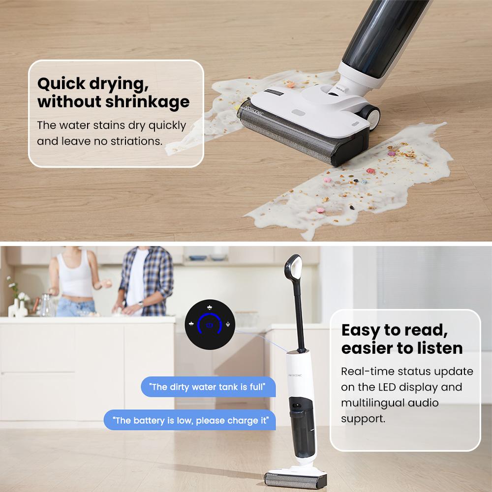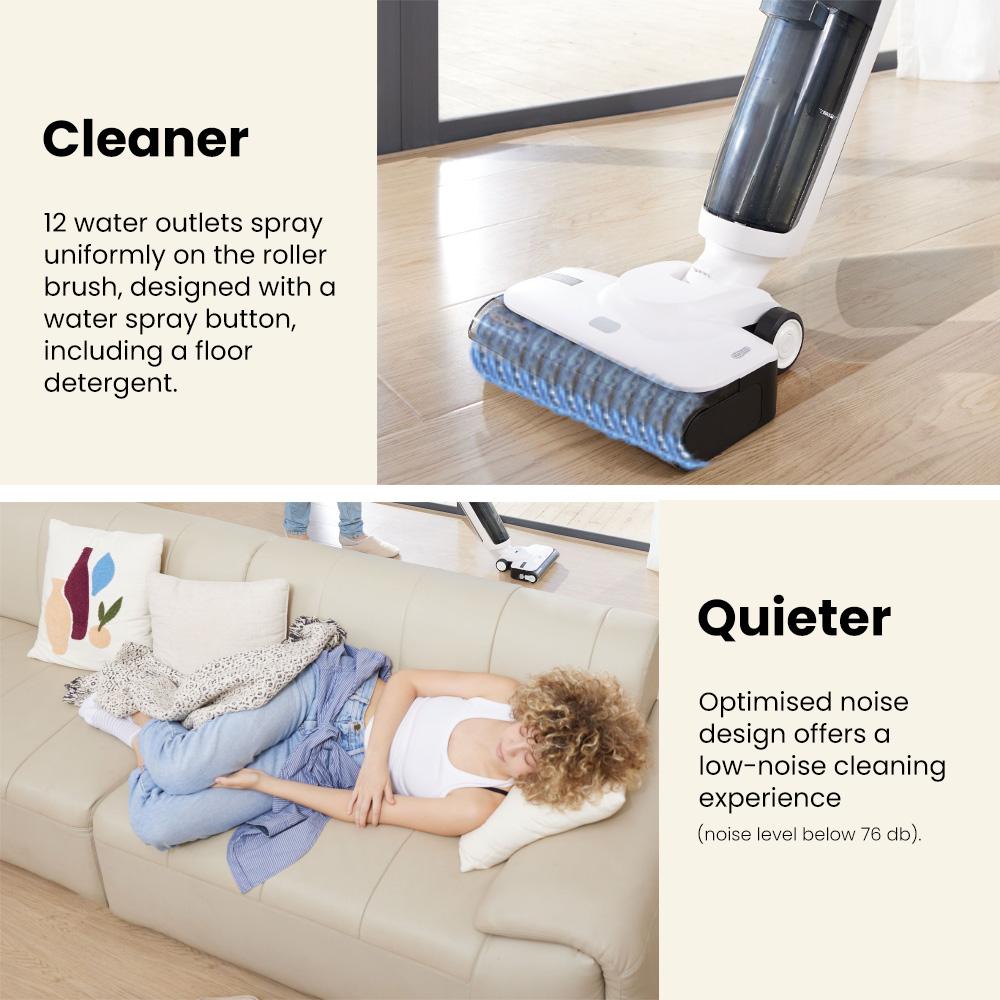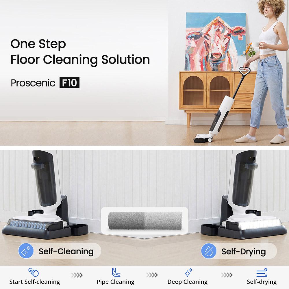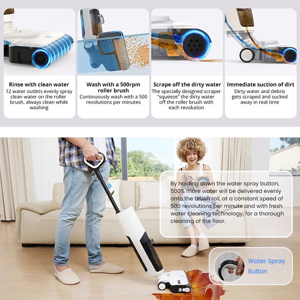 Всасывающая швабра F10 может пылесосить, вытирать и мыть.. Просто нажмите кнопку для самоочистки.. Кисть валик сушится с помощью обдува.. Идеальное решение для мытья полов за один этап, при котором вашим рукам не придется работать.