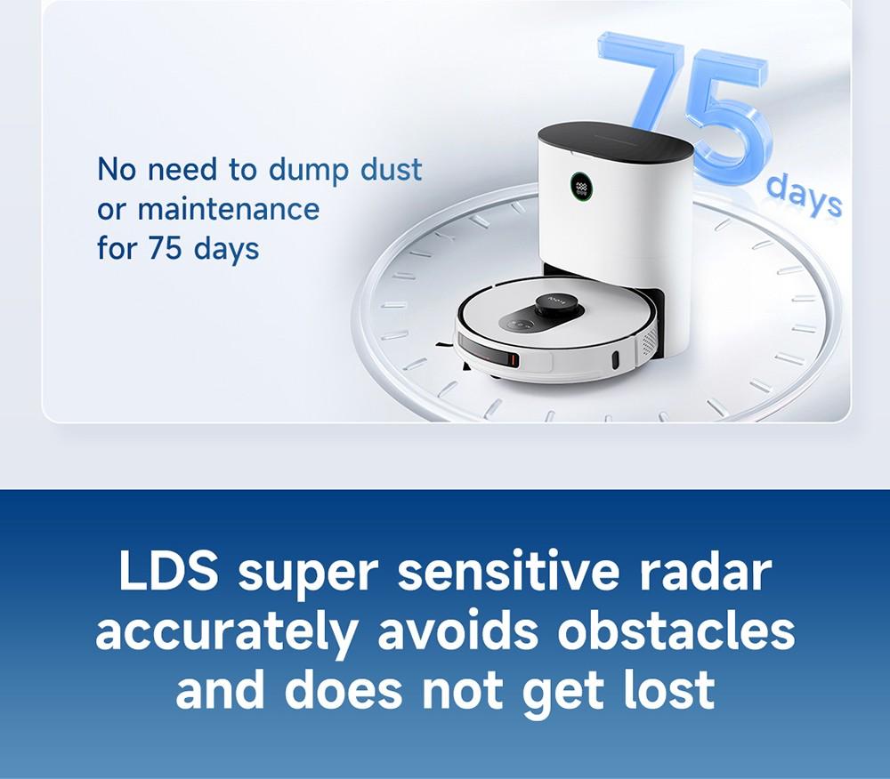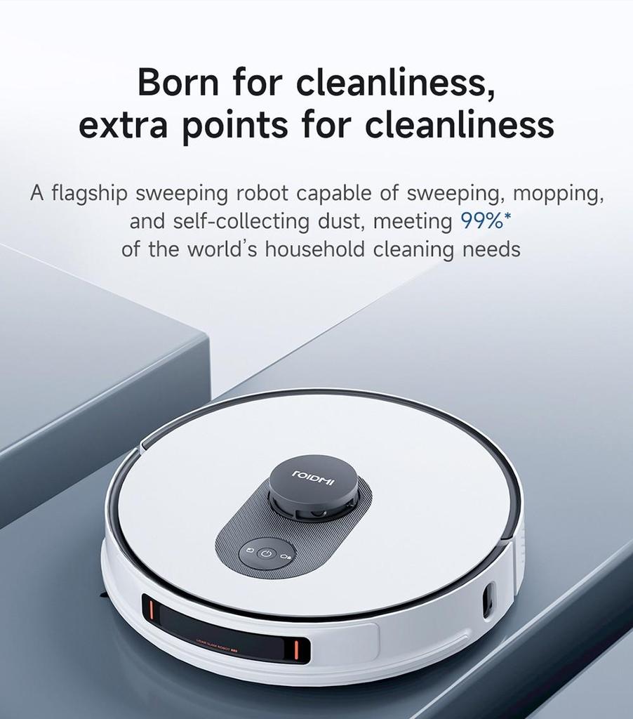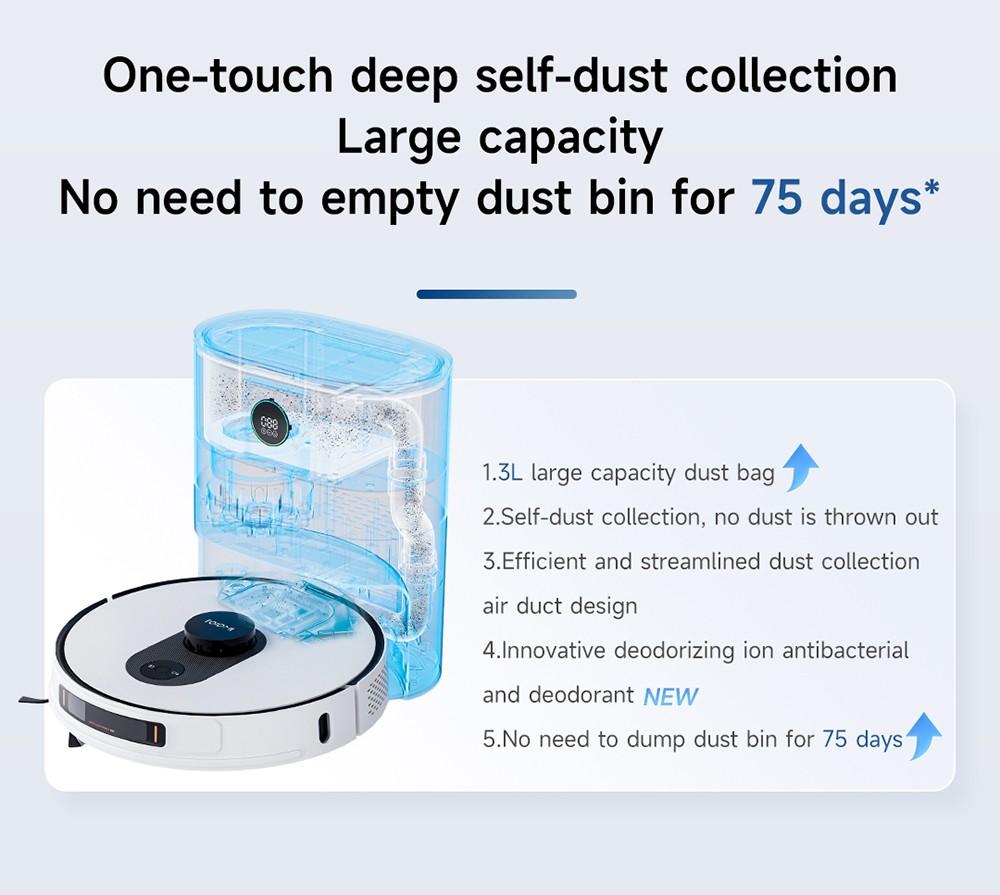Робот-пылесос ROIDMI EVE MAX поставляется с пылесборником объемом 3 л.. Удобная и обтекаемая конструкция воздуховодов для сбора пыли гарантирует, что пыль не выбрасывается наружу.. Емкость может поглощать до 75 дней мусора.. Он также оснащен инновационным дезодорирующим ионным антибактериальным средством и дезодорантом, который устраняет возможные запахи остатков пищи.