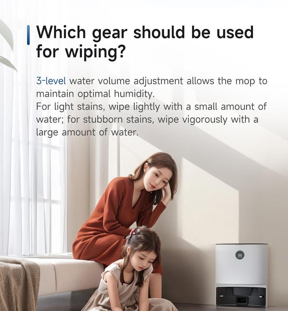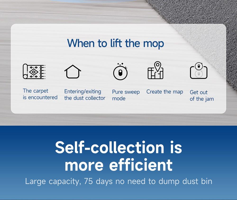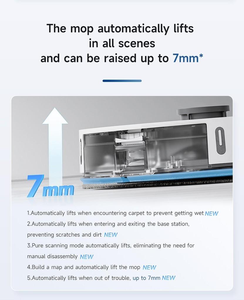 Робот-пылесос ROIDMI EVE MAX автоматически поднимет швабру при столкновении с ковром, чтобы предотвратить намокание. Автоматически поднимается при входе и выходе из базовой станции, предотвращая появление царапин и грязи.. Режим чистого сканирования автоматически поднимается, устраняя необходимость ручной разборки.. Постройте карту и автоматически поднимите швабру. Автоматически поднимается при выходе из строя и может подниматься на высоту до 7 мм.