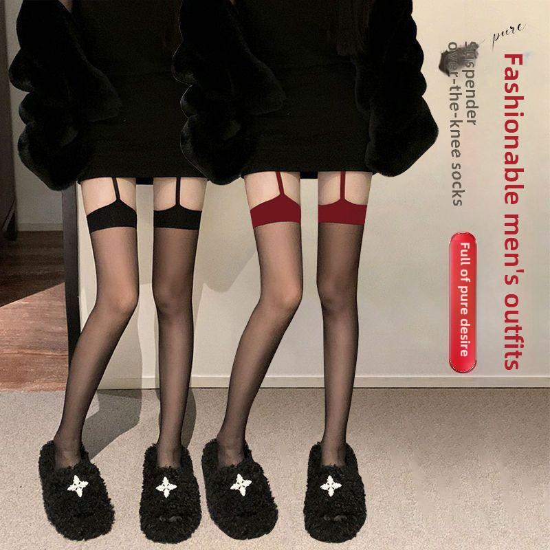 Женские сексуальные чулки с подвязками - контрастные цвета до бедра с черной и телесной отделкой