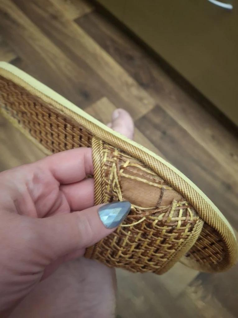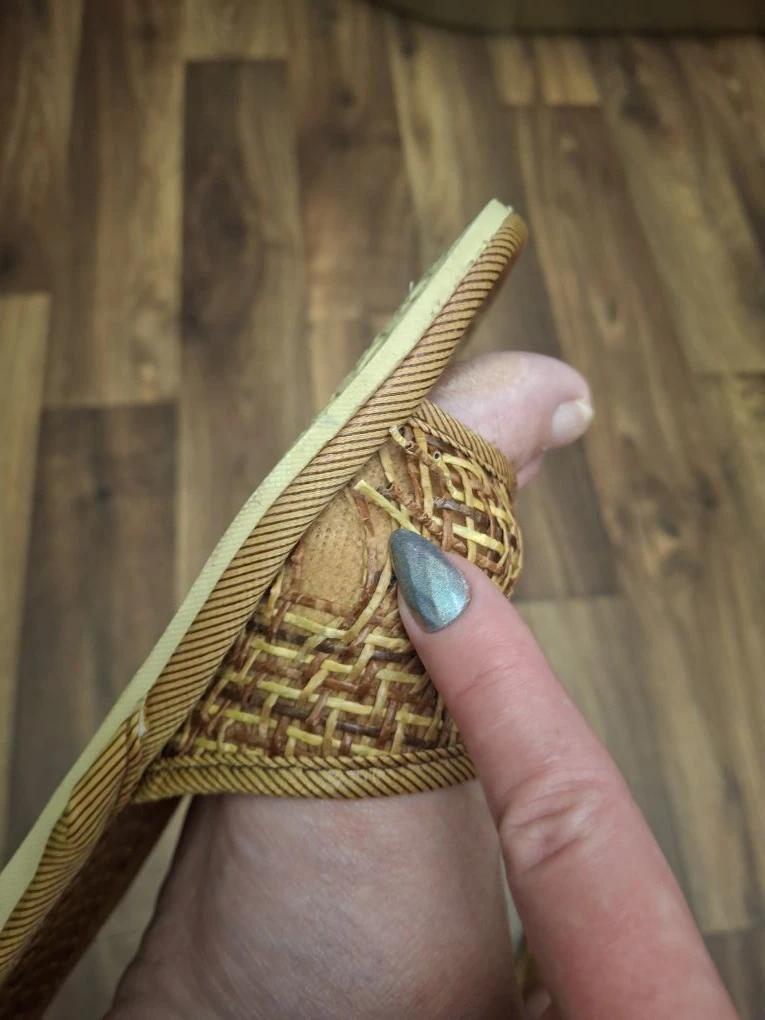 Тапки красивые и соответствуют указанному размеру. Сначала мне показалось, что сущий винил, немного прилипают к подошве стоп. Но запаха нет. Даже какой-то травкой пахнут.