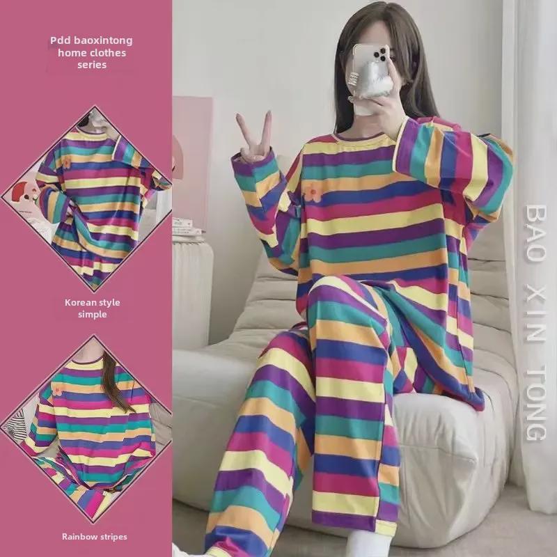 Женский пижамный комплект в радужную полоску с рисунком - свободный крой с длинными рукавами на весну/осень — купить товар онлайн с бесплатной доставкой по всему миру!