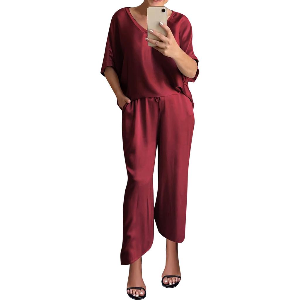 Женская мода Элегантный однотонный шелковый повседневный комплект с v-образным вырезом — купить товар онлайн с бесплатной доставкой по всему миру!