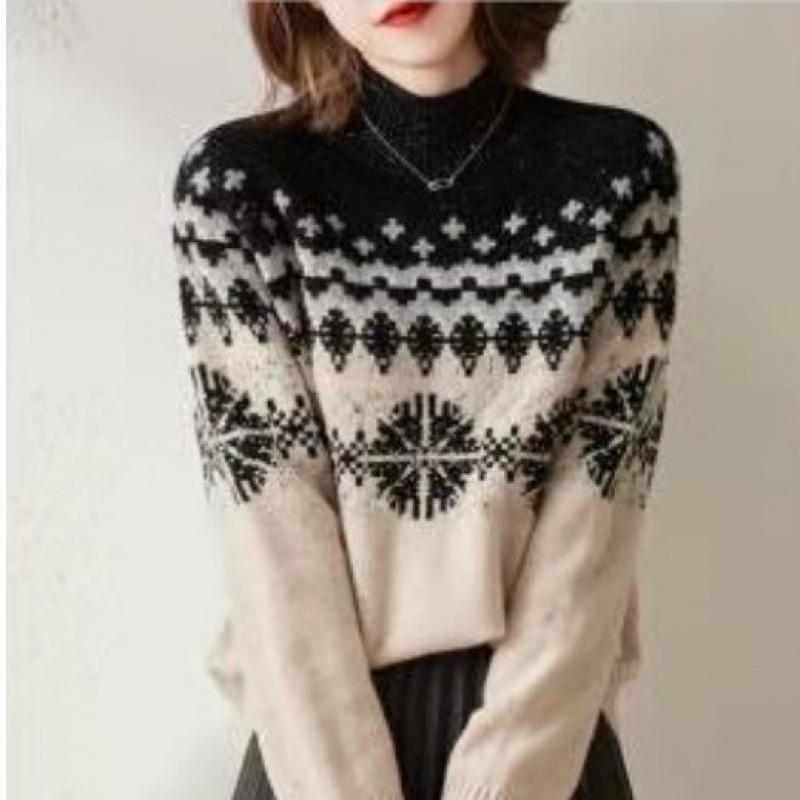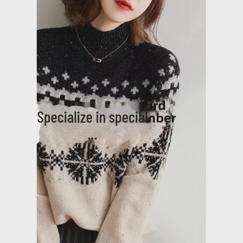Вязаный свитер с полуводолазкой в стиле ретро со снежинками на осень, зиму и весну