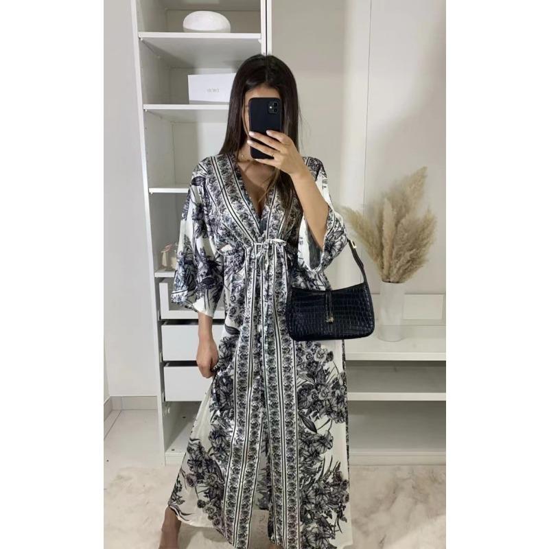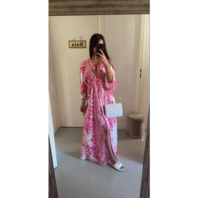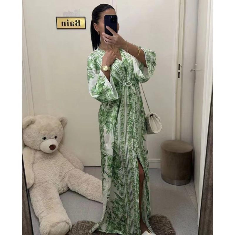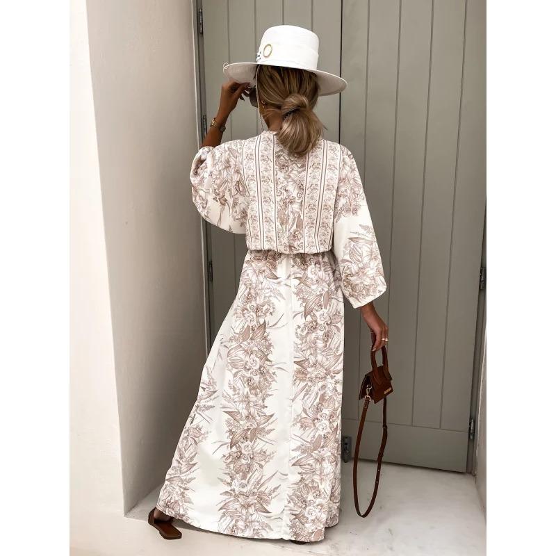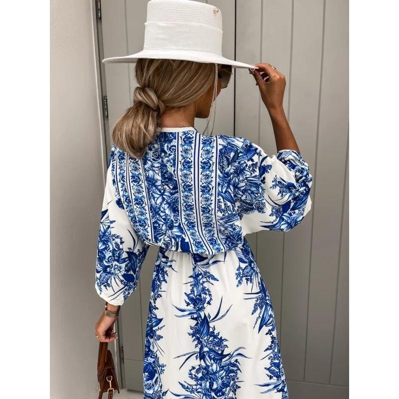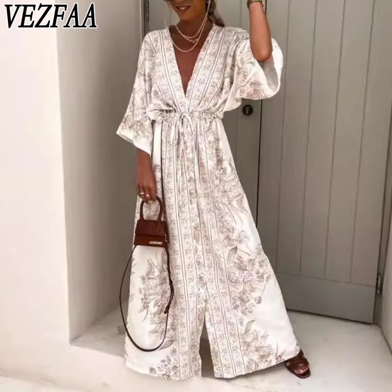 VEZFAA Женская мода Лето Весна Цветочный узор с принтом Рукава 3/4 с v-образным вырезом и высокой талией Повседневные платья