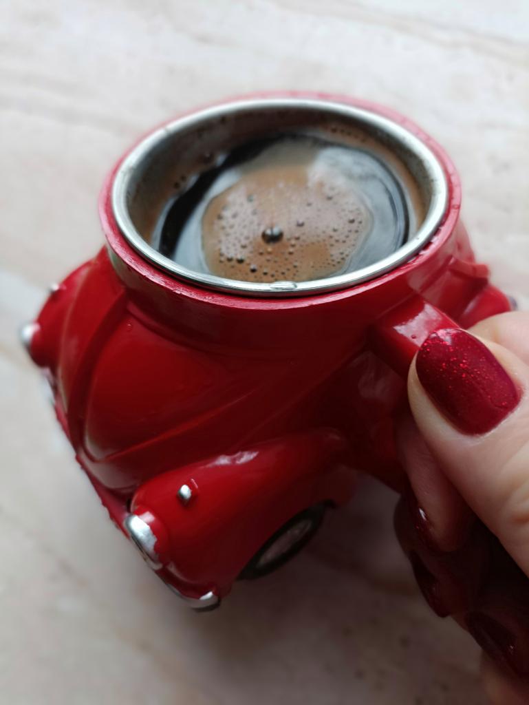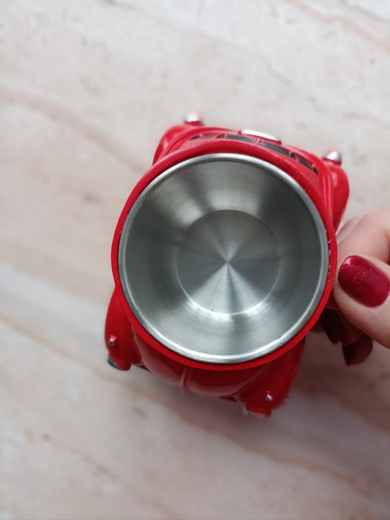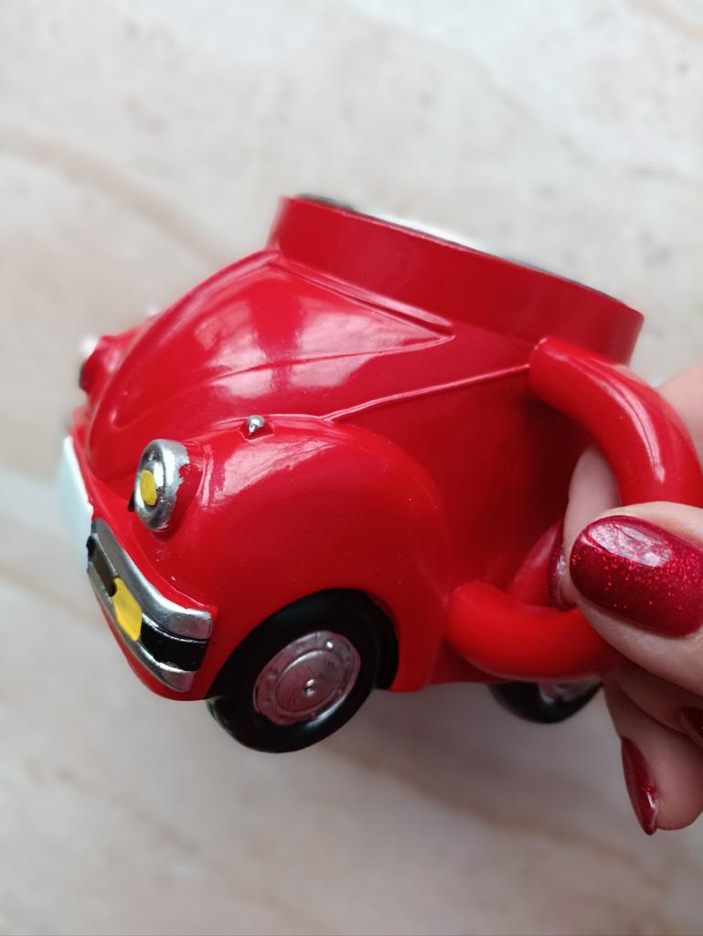 Хорошенькая кружка-машинка 🥰 Она совсем небольшая, как раз кофе пить. Я для этого ее и заказывала, и цвет у машинки дамский, красный... уж если нет у меня своей машины, так хоть кружка в виде машинки пусть будет! Такая кружечка удовлетворит эстетический вкус любого кофемана, а ещё будет идеальным подарком мужчине на Новый Год, или на 23 февраля. Кружка лёгкая, сделана из чего-то вроде пластика. Она компактная, все детальки гладкие, ничего не торчит и царапает; в руке держать удобно. Внутри вставка из нержавеющей стали. Пришла в коробке, внутри была ещё одна коробка, из пенопласта, и ещё сама кружка была завернуть плотно в целлофан. Так что доставили целехонькой. Можно брать. Рекомендую 👍