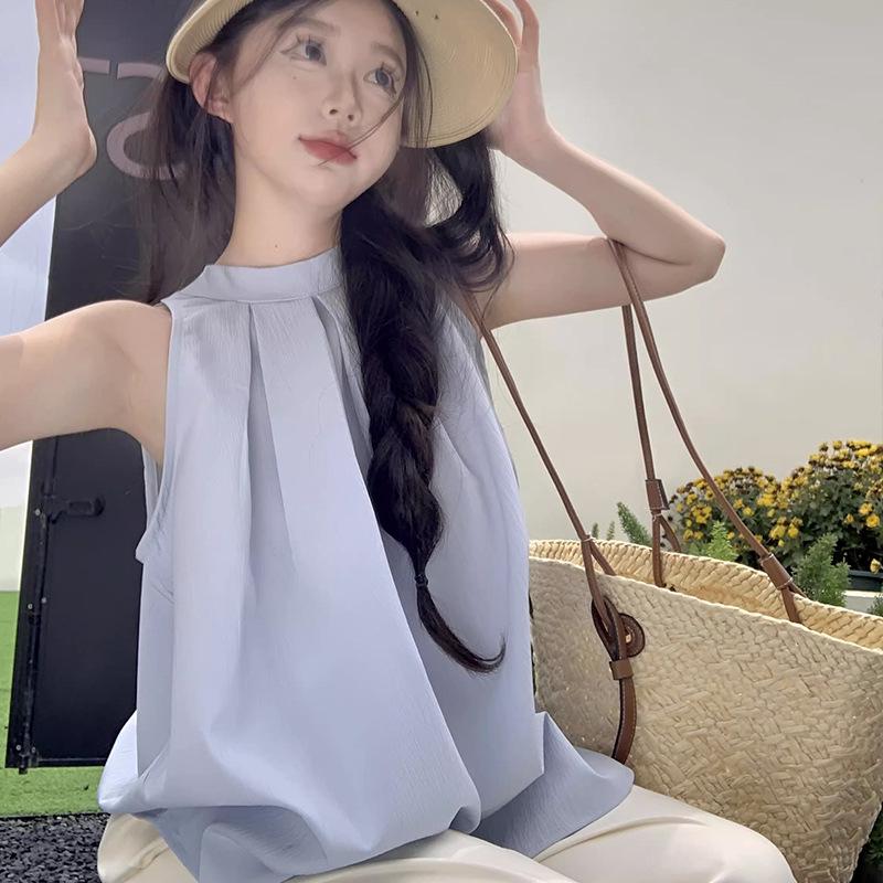 Шикарный французский синий плиссированный топ без рукавов для женщин - модный летний дизайн