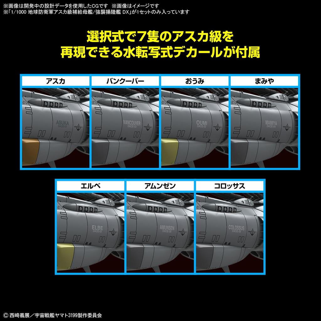 ・Набор DX из серии «Yamato Forever REBEL 3199», который позволяет выборочно воспроизводить семь кораблей класса «Аска», теперь доступен в масштабе 1/1000! Включает цветные детали, которые можно выборочно воспроизвести как транспортный корабль снабжения или десантный корабль.. Линии палубы корпуса воспроизведены с точными деталями и наклейками для переноса воды.. На наклейке для переноса воды также указаны название судна и номер типа.. Семь кораблей класса «Аска» можно воспроизвести с помощью формулы выбора. В комплект входит постамент для демонстрации.