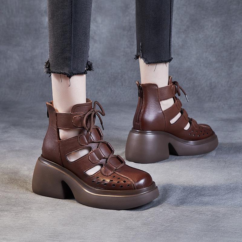 Женские ретро-римские сандалии из коровьей кожи: Коллекция лета 2024 г. — толстая подошва, ажурный дизайн, сетчатый стиль сапог