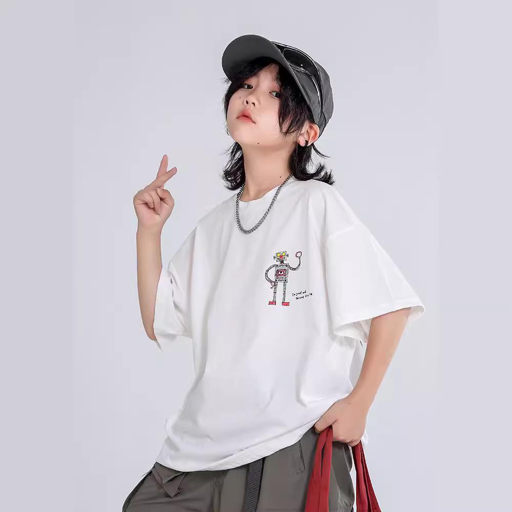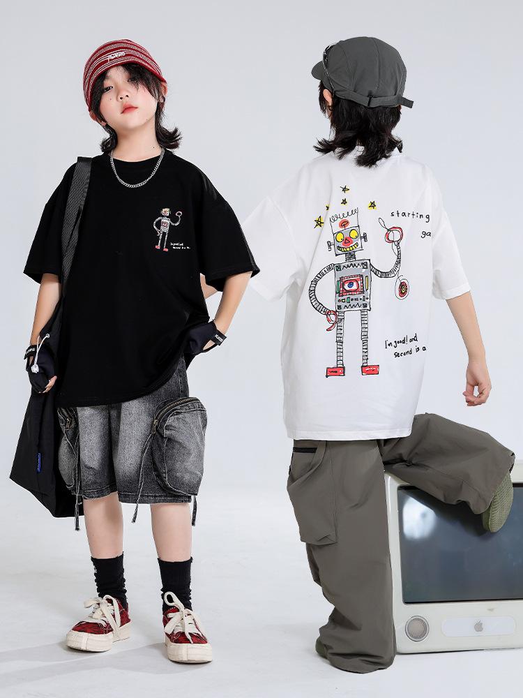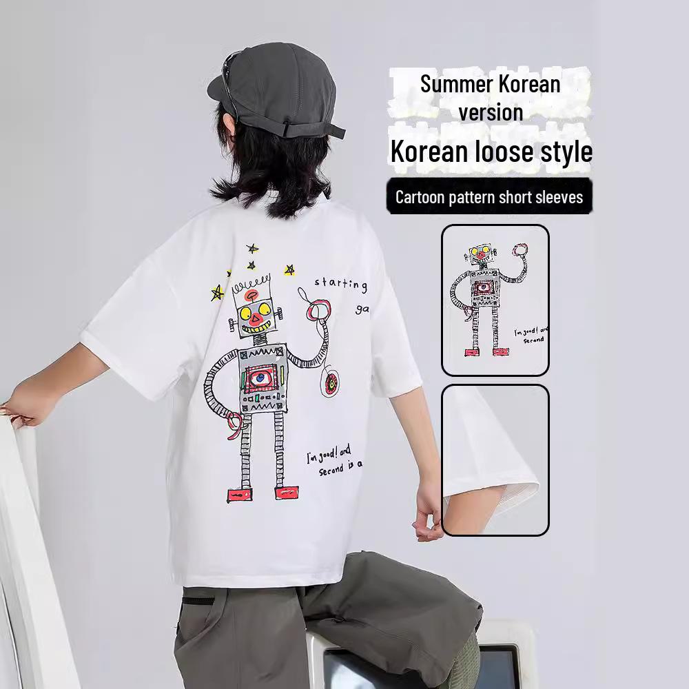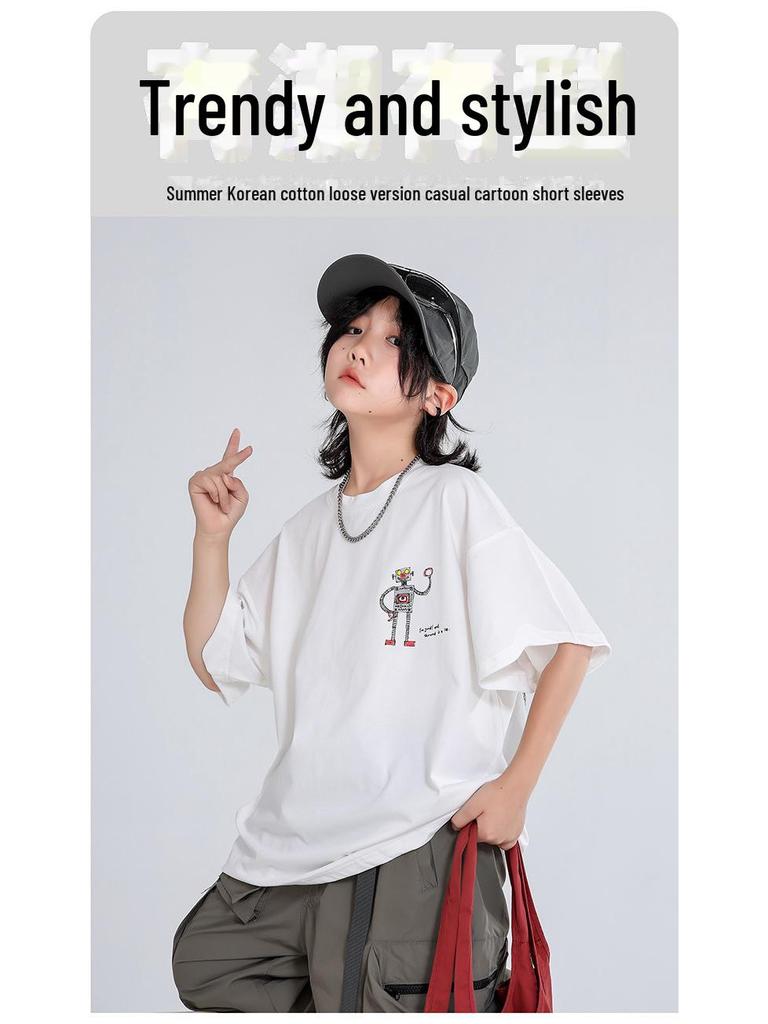 Эта очаровательная хлопковая футболка создана специально для мальчиков и украшена забавными мультяшными рисунками, которые обязательно понравятся. Изготовленный из высококачественного хлопка, он мягкий и дышащий, идеально подходит для повседневной носки.. Благодаря коротким рукавам эта футболка идеально подходит для сохранения прохлады и комфорта в теплые месяцы.. Яркие и веселые мультяшные узоры добавляют нотку корейского стиля, делая эту модель яркой деталью гардероба любого мальчика.