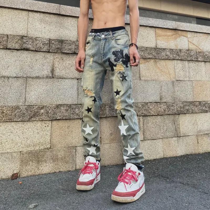 Узкие джинсы с кожаными нашивками и ретро-звездами унисекс — купить товар онлайн с бесплатной доставкой по всему миру!