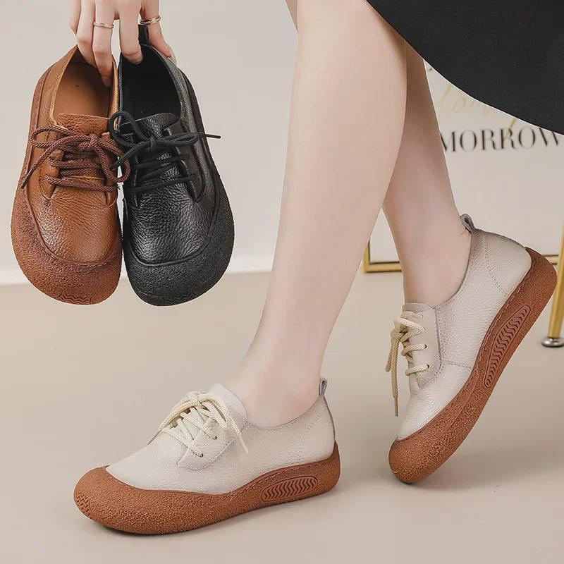 Женские кожаные туфли на шнуровке в стиле ретро — с круглым носком, мягкой подошвой, удобные повседневные туфли на плоской подошве для весны и осени
