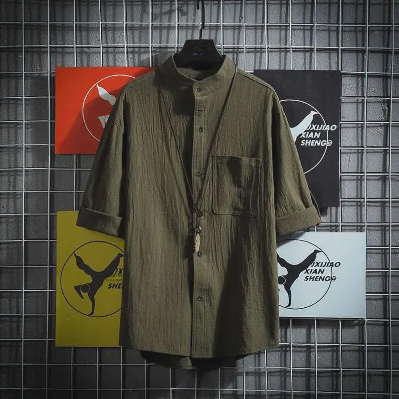 Мужская рубашка больших размеров в японском стиле с воротником-стойкой и короткими рукавами, однотонная