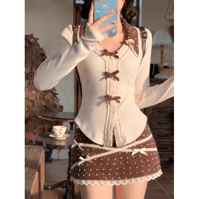 Женский очаровательный кружевной костюм с юбкой - весна и осень в корейском стиле — купить товар онлайн с бесплатной доставкой до всему миру!