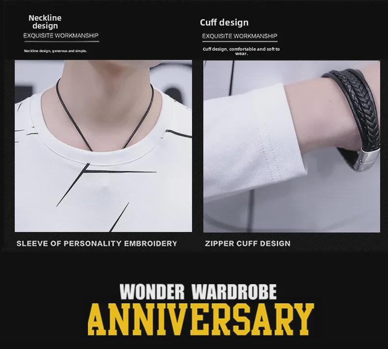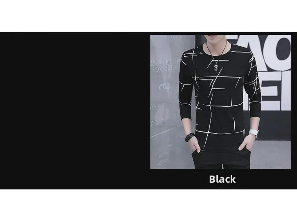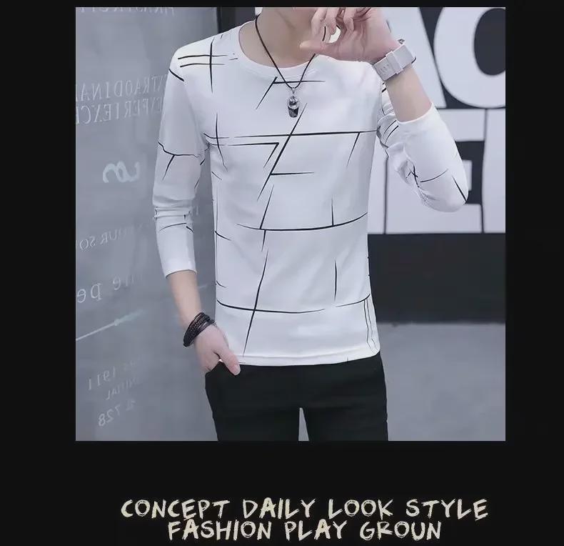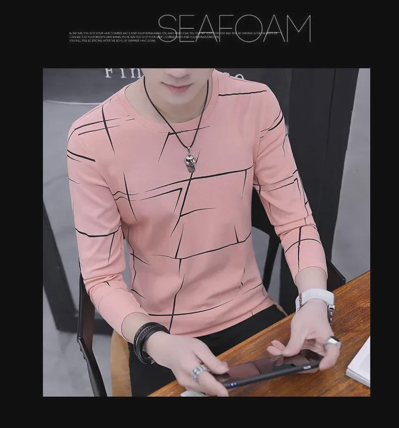 Мужская облегающая футболка в корейском стиле с длинными рукавами и круглым вырезом в полоску на осень