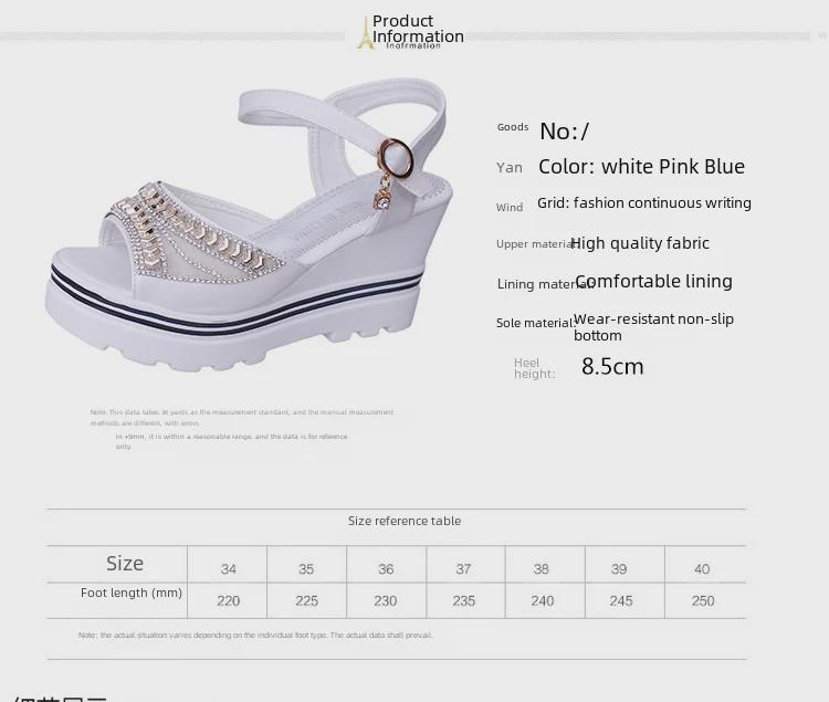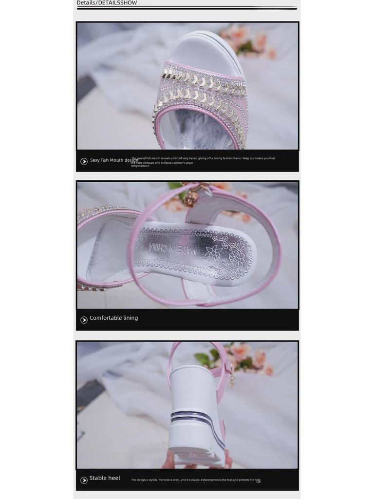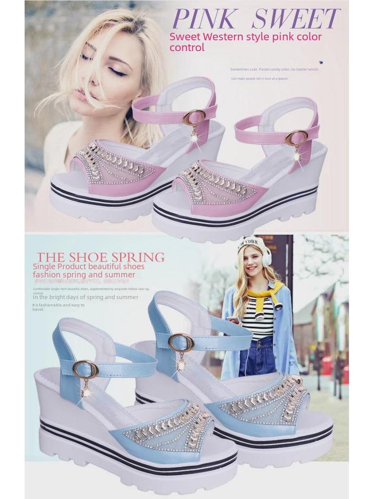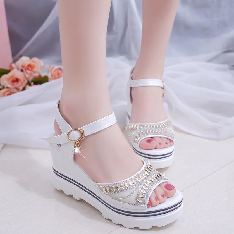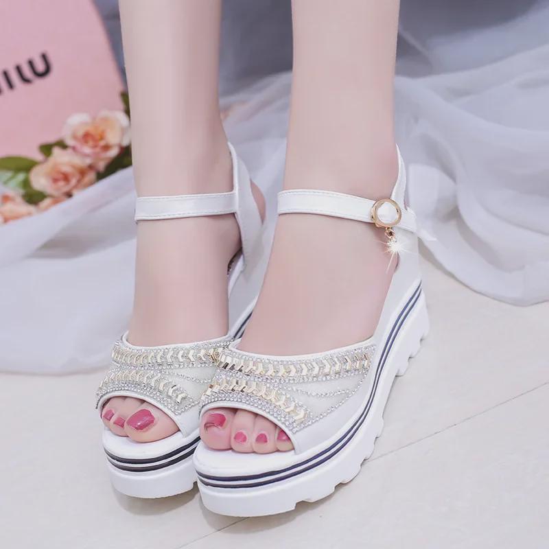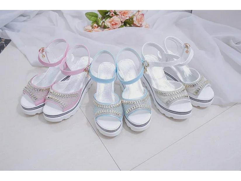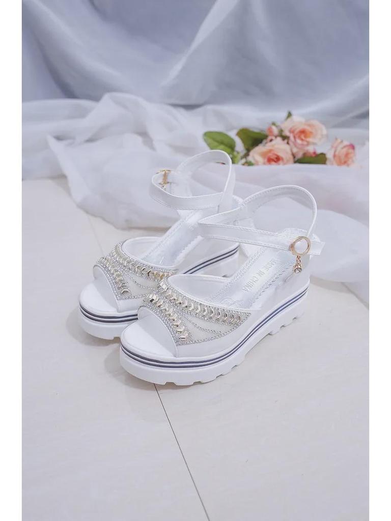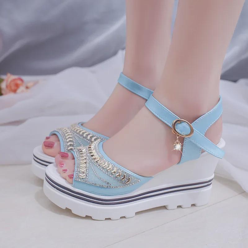 Женские летние босоножки на танкетке — со стразами, с одной пряжкой, с открытым носком