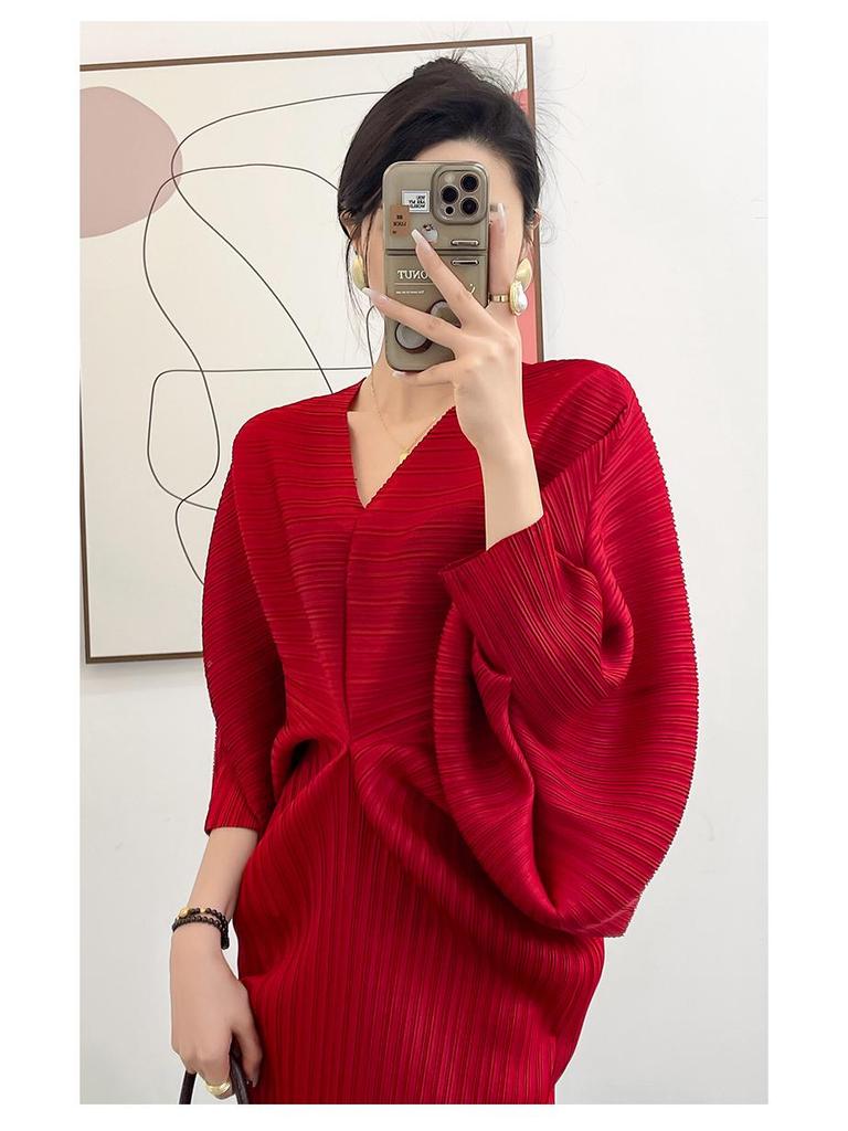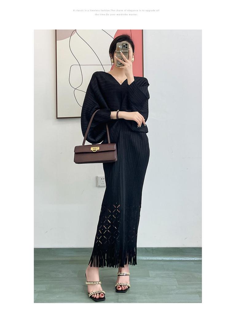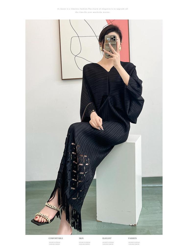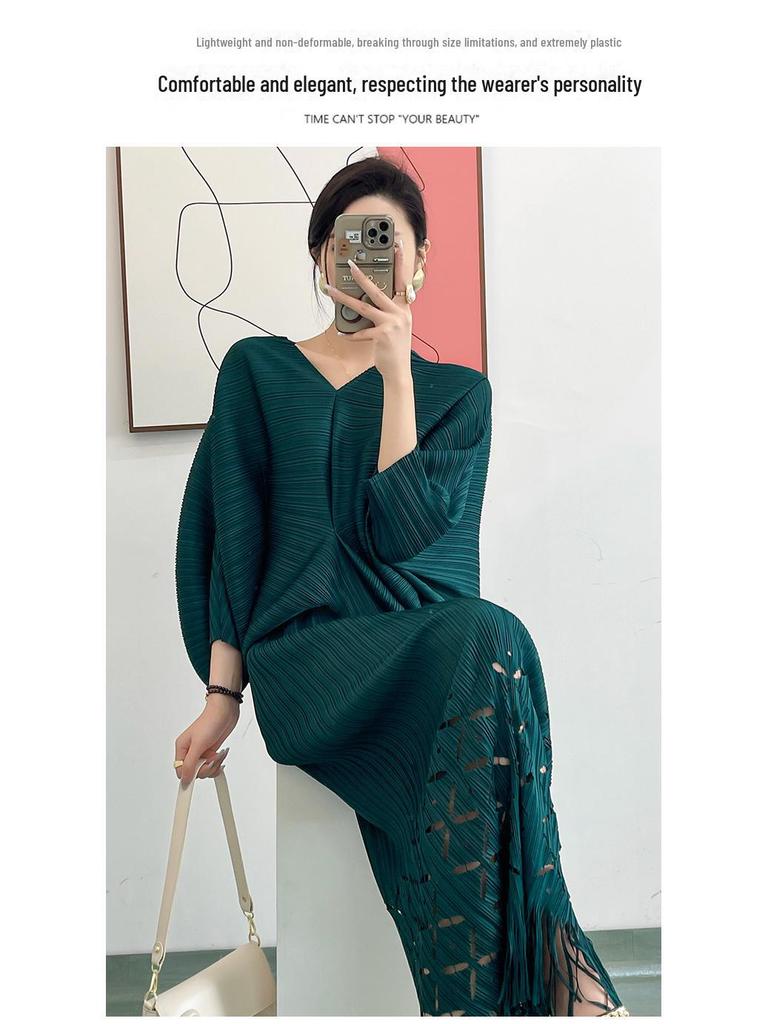 Miyake Pleated Large V-Neck Fishtail Tassel Dress with Bat Sleeves, 2025 Collection