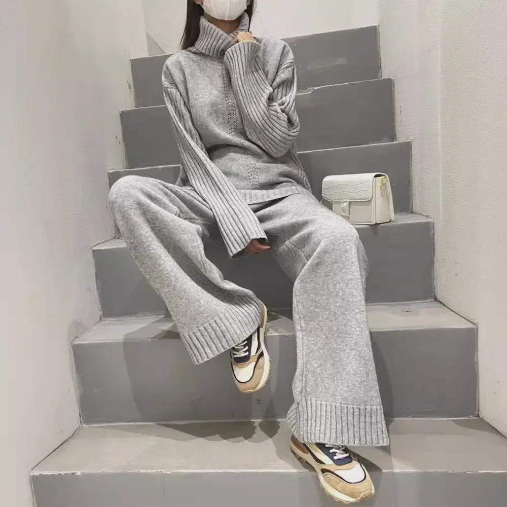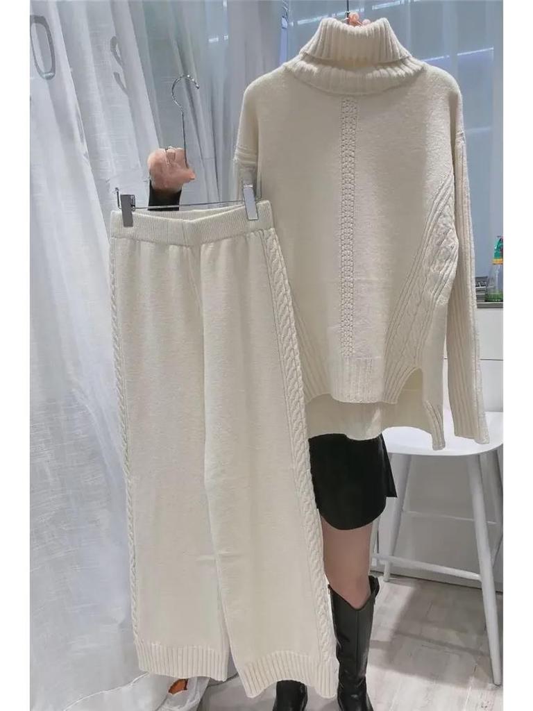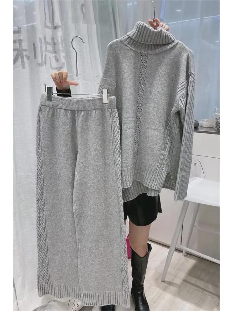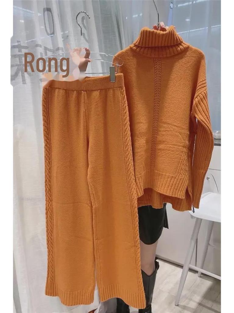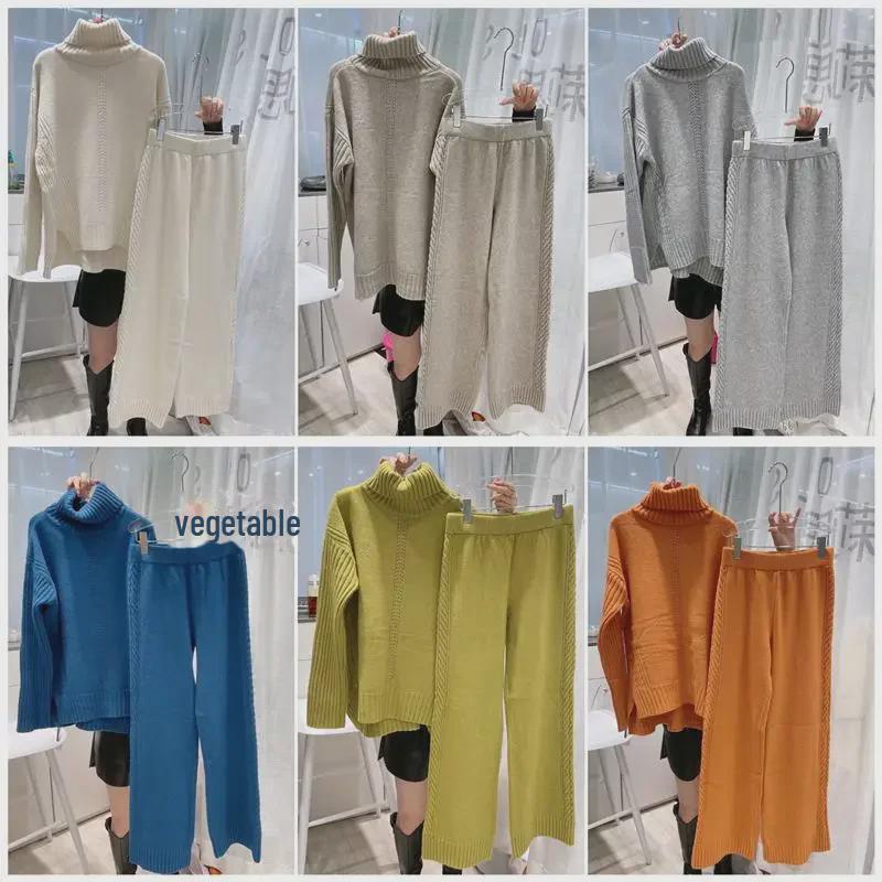 2023 Осень/Зима Европейский трикотажный свитер с высоким воротом и широкие брюки Модный женский костюм из двух частей